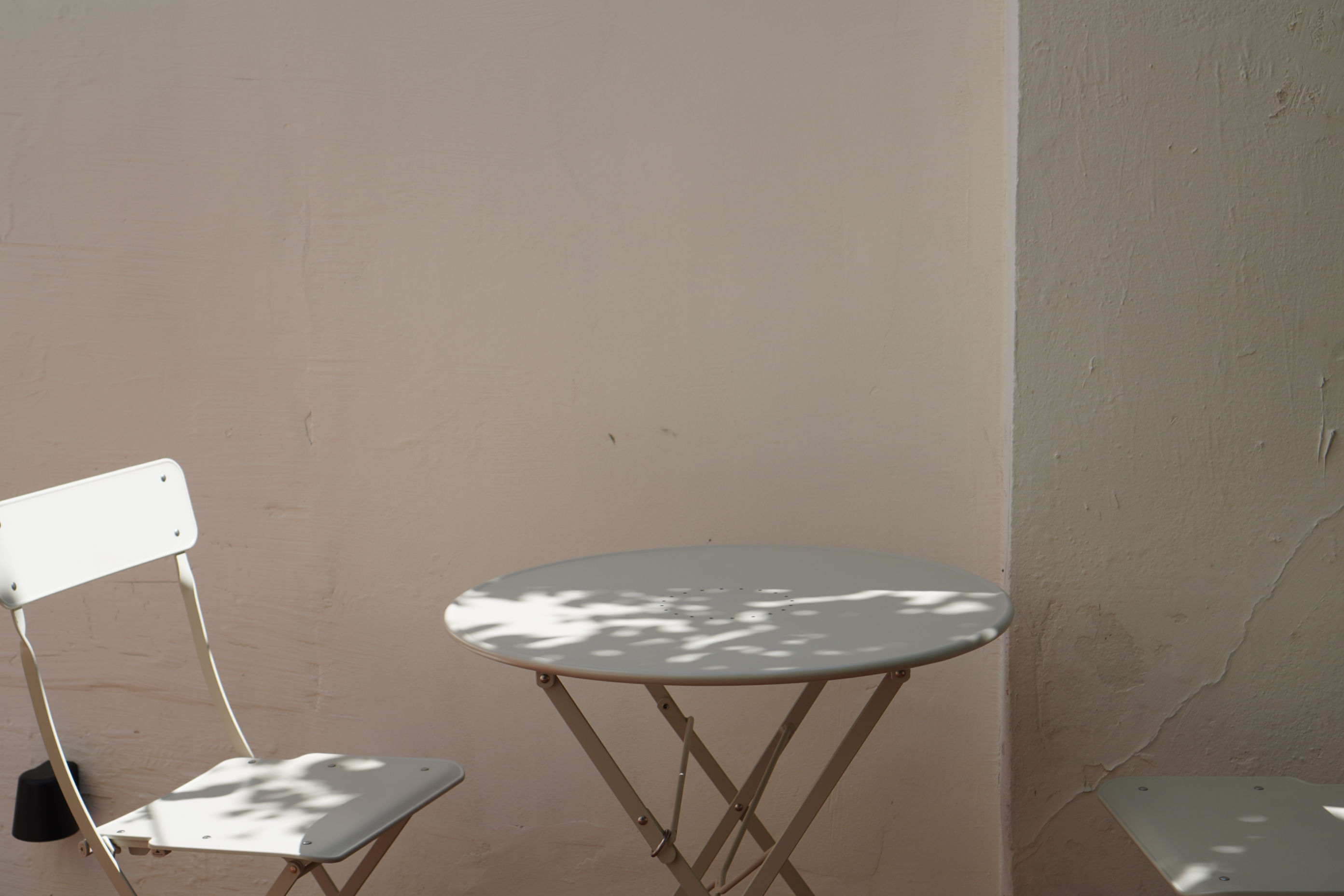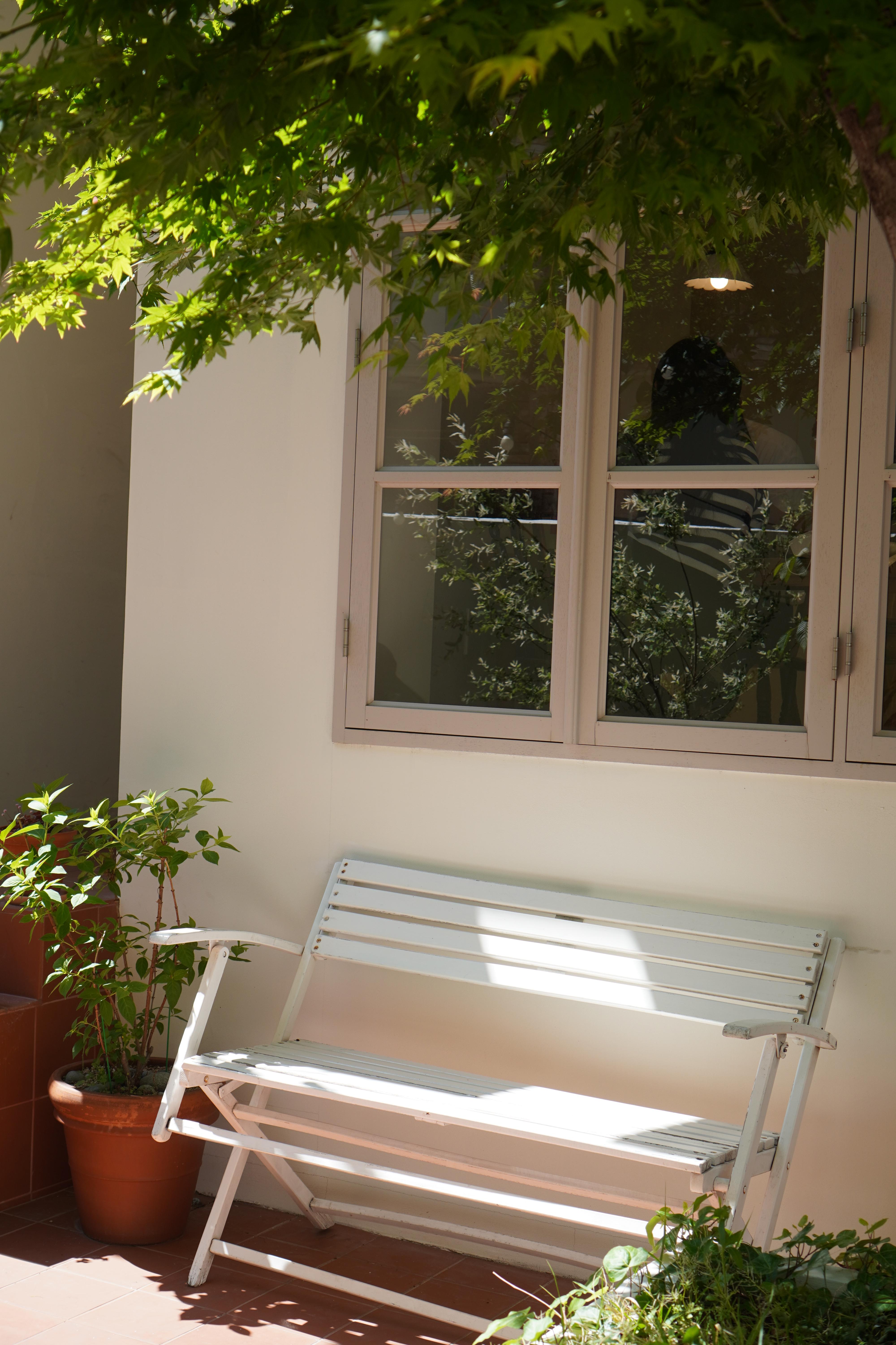유럽의 어느 한 작은 카페 같은 감성. 아이보리 톤에 흰 의자만 놓여 있을 뿐인데 정말 예쁩니다. 그냥 막 사진 찍어도 잘 나오는 정원 분위기 보세요.