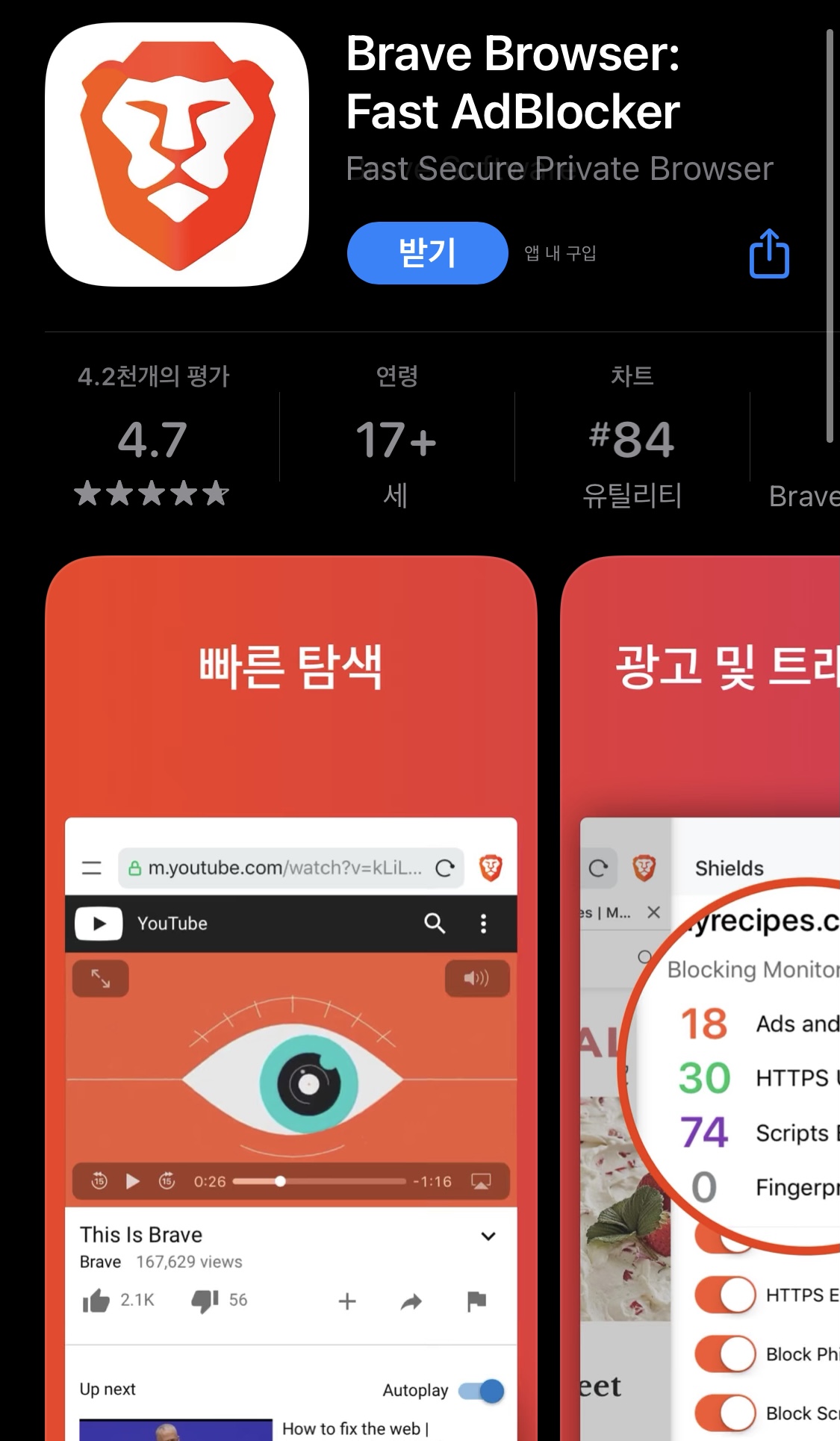 스토어에서 브레이브를 검색시 브레이브 브라우저 앱이 뜹니다.