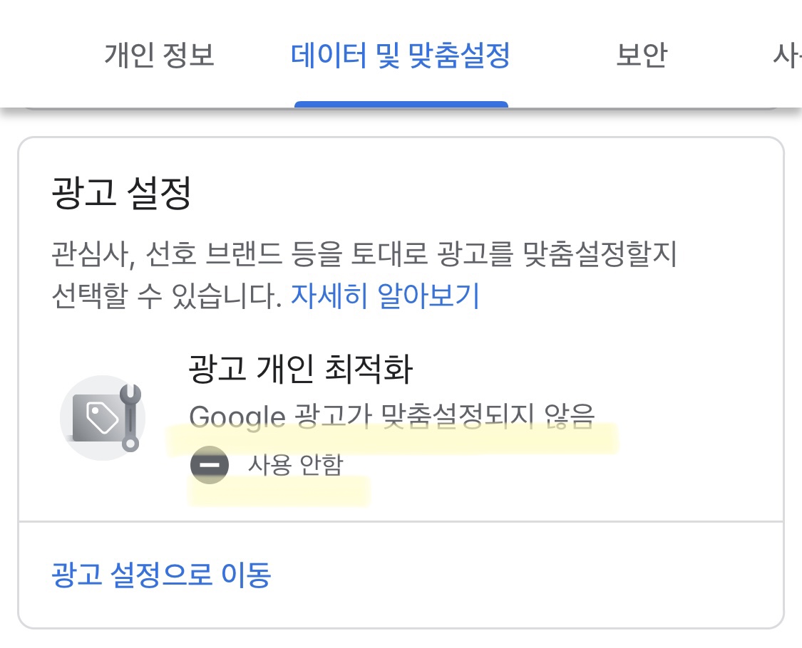 바로 아래에 광고설정 칸으로 갑니다. 광고 개인 최적화(구글 광고가 맞춤설정)를 사용안함으로 바꿔줍니다. 아래에 광고 설정으로 이동합니다.