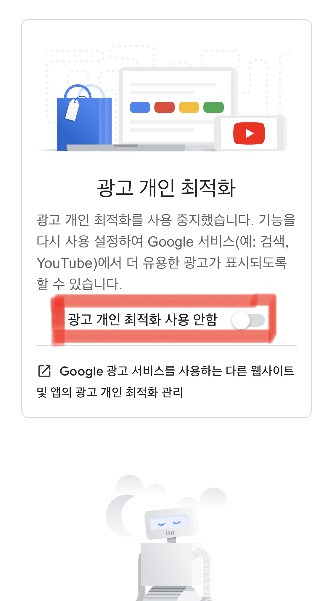 광고 개인 최적화 사용 안함으로 바꿔주면 됩니다.