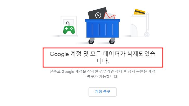 Google 계정에 등록된 모든 데이터가 삭제되었습니다. 혹시 실수로 계정을 삭제를 한 경우에는 삭제 이후 잠시동안 계정 복구가 가능합니다. 그런 상황에는 아래에 [계정복구]를 클릭하여 복구할 수 있습니다.