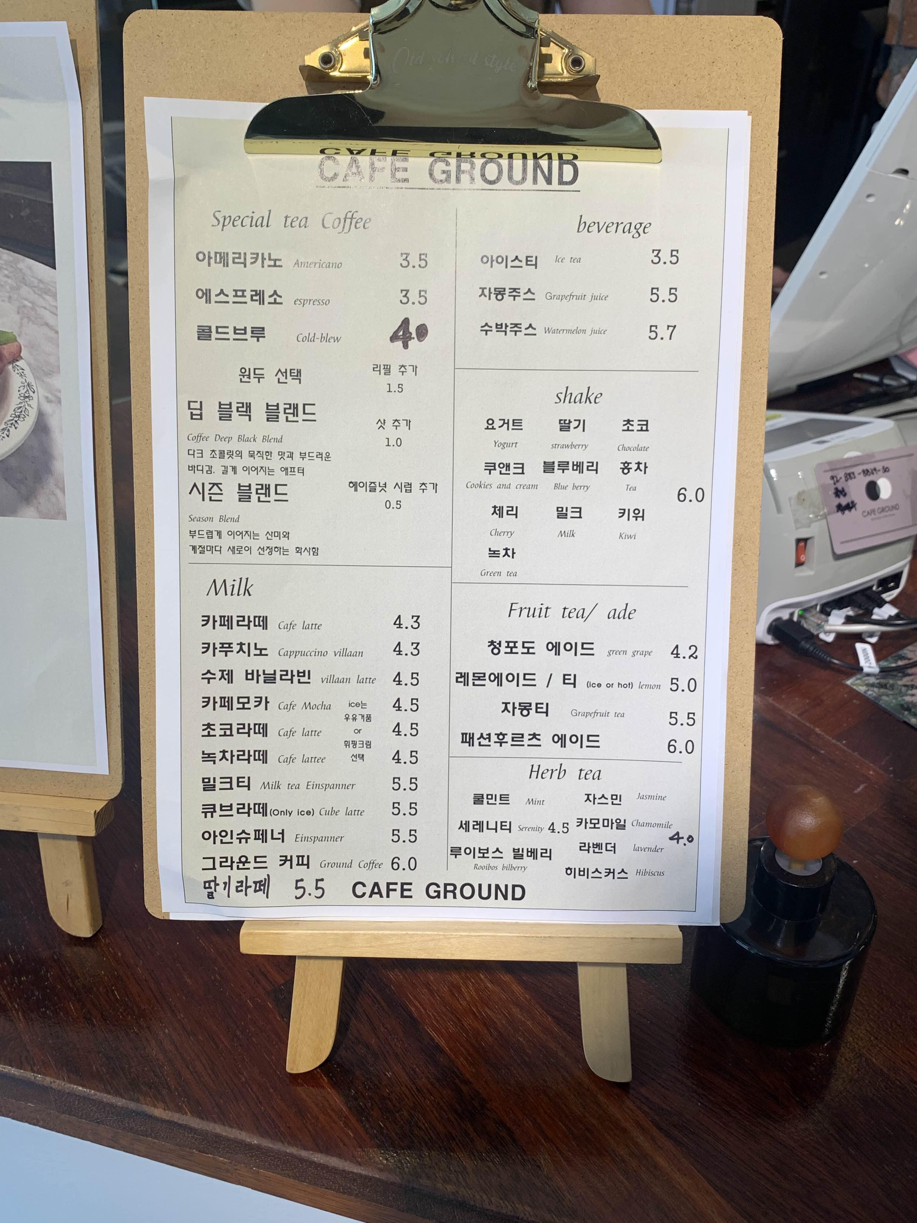 카페 그라운드 가격입니다. 가장 기본적인 아메리카노 가격은 3500원 정도로 저렴한 가격대입니다.