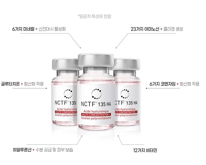 NCTF : New Cell Treatment Factor의 약자로 최신 세포 치료 인자의 약칭입니다. 섬유아세포의 기능 향상이 임상적으로 증명된 복합성분입니다. 색소침착, 주름 및 탄력이 떨어진 피부에 활력을 주기 때문에 건강한 피부를 만들어 줍니다.