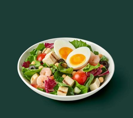 닭가슴살, 새우, 반숙 계란과 야채가 들어간 샐러드입니다. 드레싱은 화이트 발사믹 드레싱입니다. 다이어터나 가벼운 한 끼 찾는 사람에게 추천!