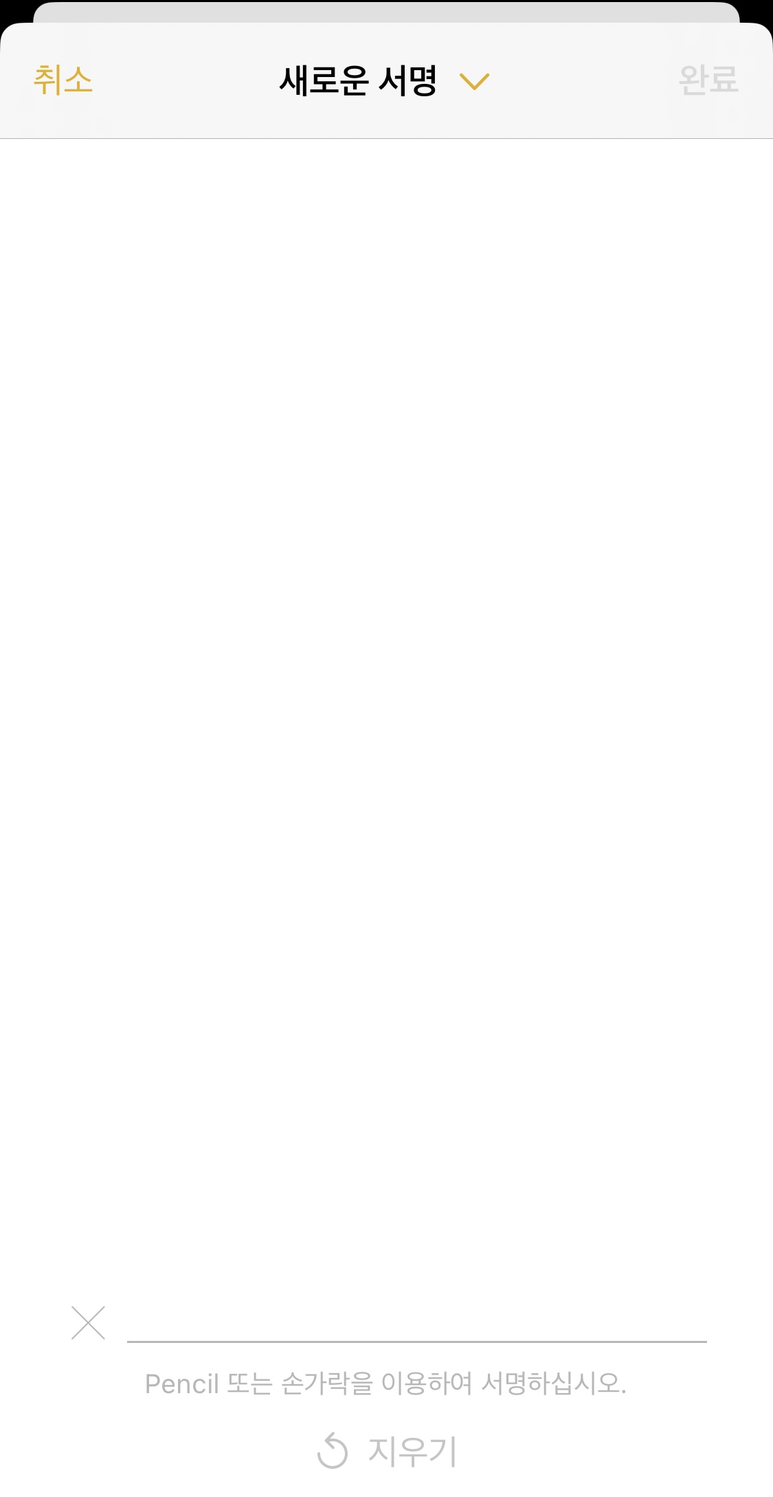 바로 서명을 작성할 수 있는 공간이 나옵니다. 여기서 새로운 서명을 손가락을 사용하거나 애플 펜슬 등으로 새로운 사인을 생성할 수 있습니다.