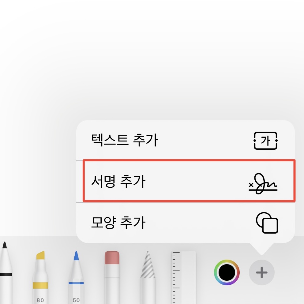 아래에 여러 펜 메뉴가 나옵니다. 여기서 + 메뉴를 눌러준 후 [서명 추가]를 탭해줍니다.