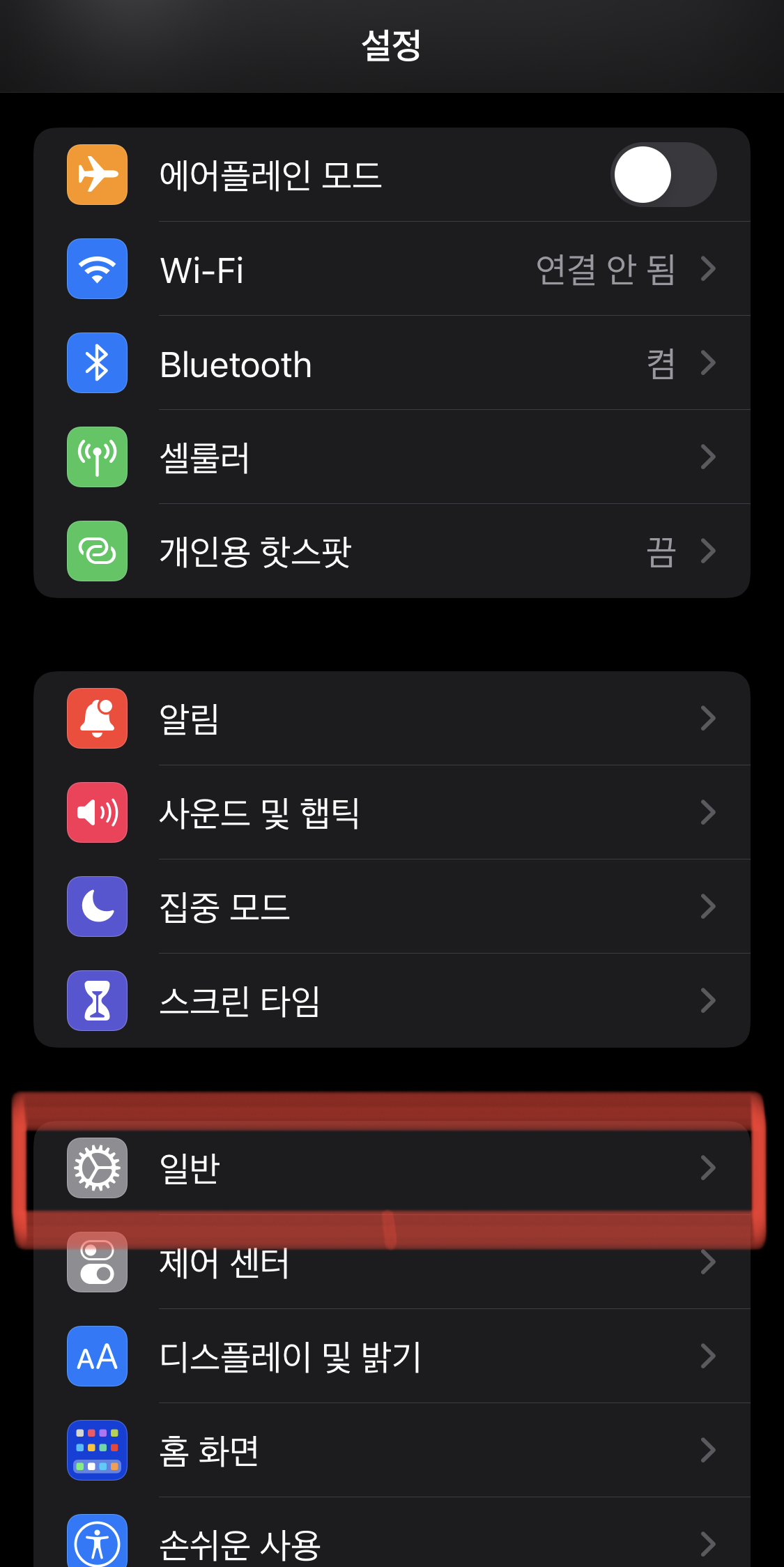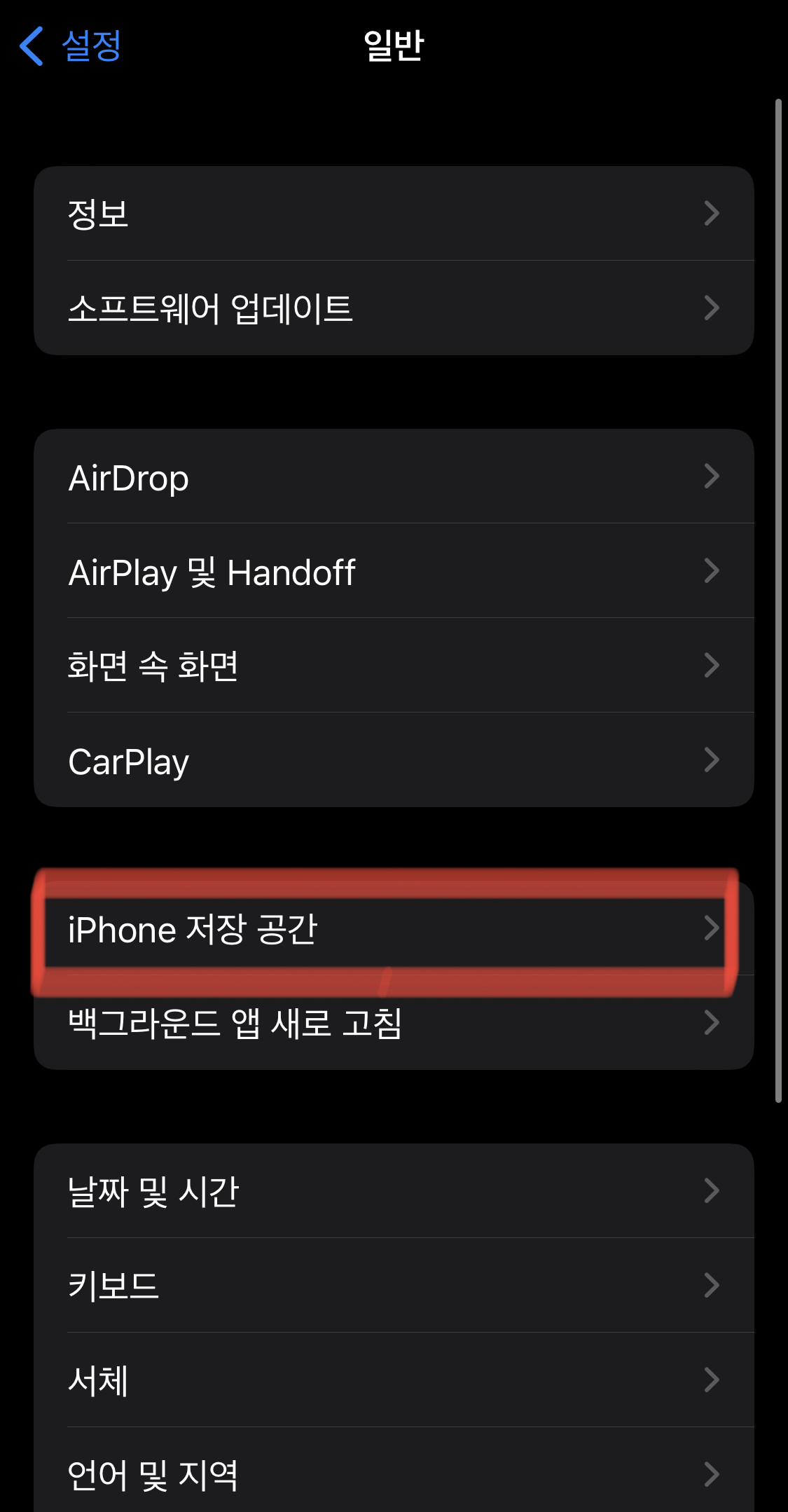 일반에 들어가면 중간에 [iPhone 저장공간]을 탭 해줍니다.