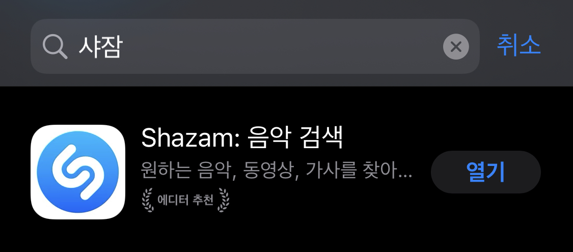 다른 방법으로 샤잠 앱을 엽니다. 그리고 주변 기기를 통해 아무 노래를 재생합니다. 그리고 Shazam 앱을 열고 가운데 원형 모양의 Shazam 버튼을 누르면 해당 노래의 정보가 나옵니다.