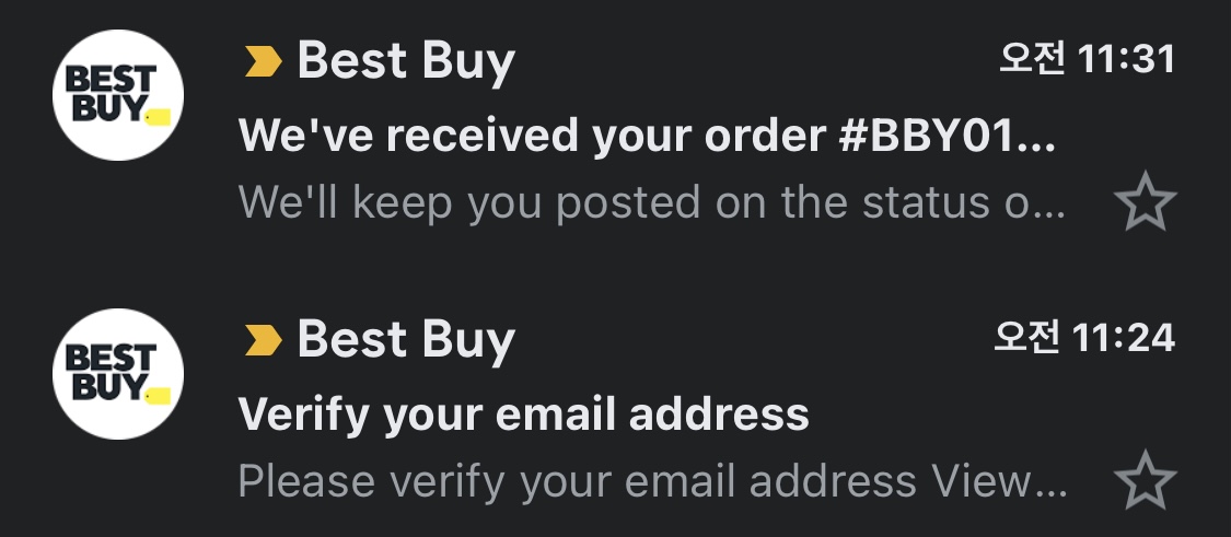 완료하고 나면 위와 같은 화면으로 넘어갑니다. 이제 기입한 이메일로 들어가면 베스트바이로부터 온 메일을 받을 수 있습니다.