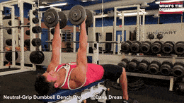 덤벨을 밀어올리는 동작에서 양손이 벌어지지 않게 살짝 모아주면서 대흉근의 수축을 최대화합니다. 이때 덤벨이 서로 부딪히지 않아야 한다는거~!