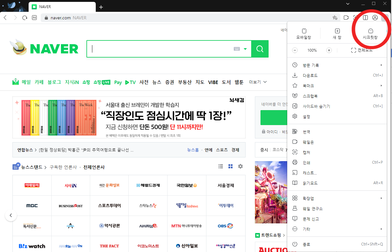 메뉴를 클릭하면 오른쪽 상단에 [시크릿창]을 발견할 수 있습니다.