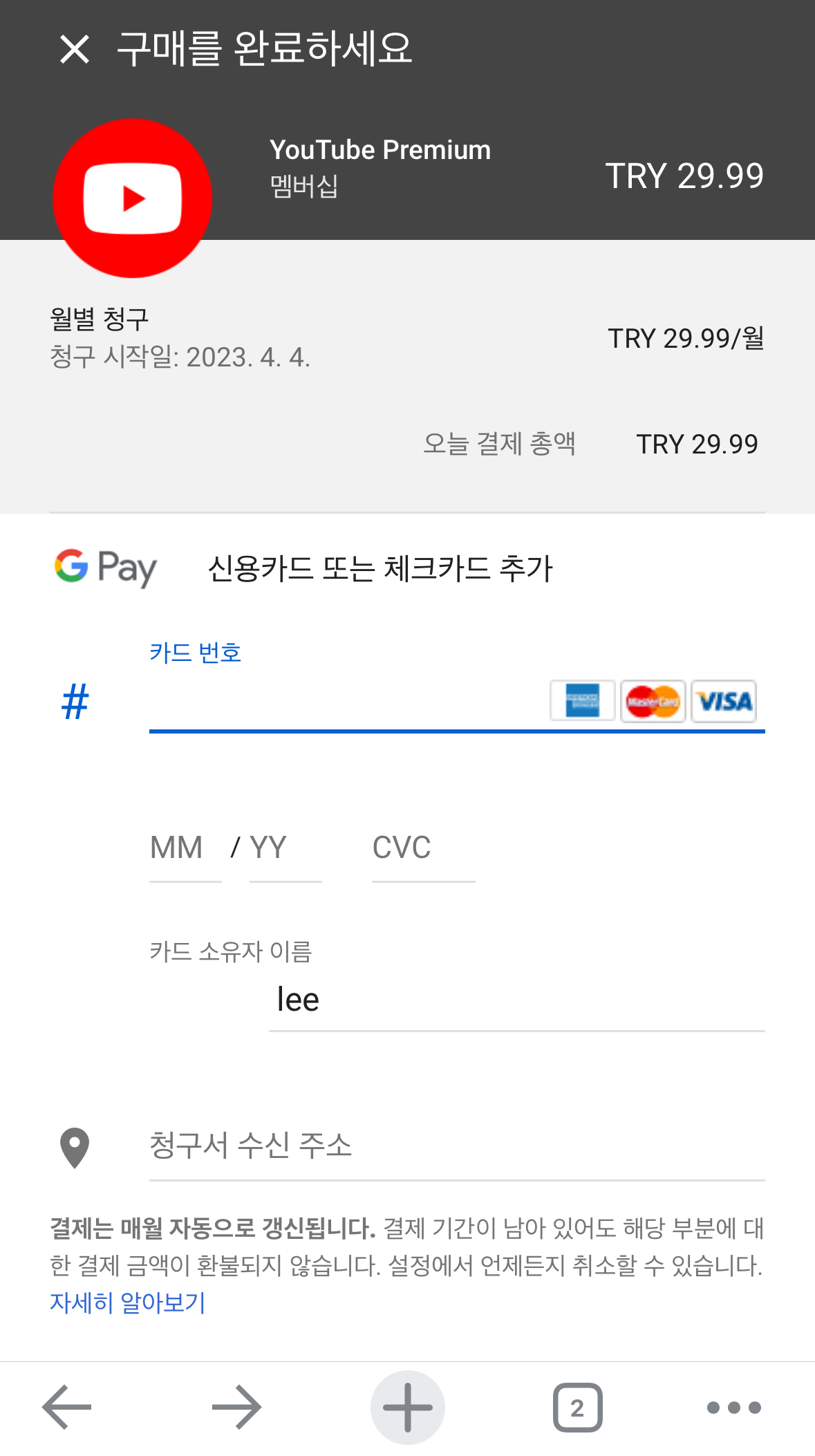 결제 페이지로 넘어갑니다. 이 페이지에서 다시 한번 터키 환율로 TRY29.99로 되어있는지 확인해 주세요. 아르헨티나에서 비자카드가 막혔지만 튀르키예에서는 비자카드도 가능합니다. 참고로 결제하려고 하는 카드가 해외 결제가 막혀있지 않은가 한번 확인해 주세요. 그리고 구매버튼을 눌러줍니다.