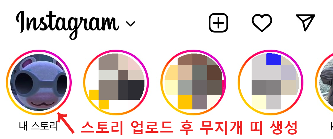 인스타그램 홈화면에 들어옵니다. 스토리 업로드 후 내 프로필 부분에 무지개 띠가 생긴 것을 확인할 수 있습니다.