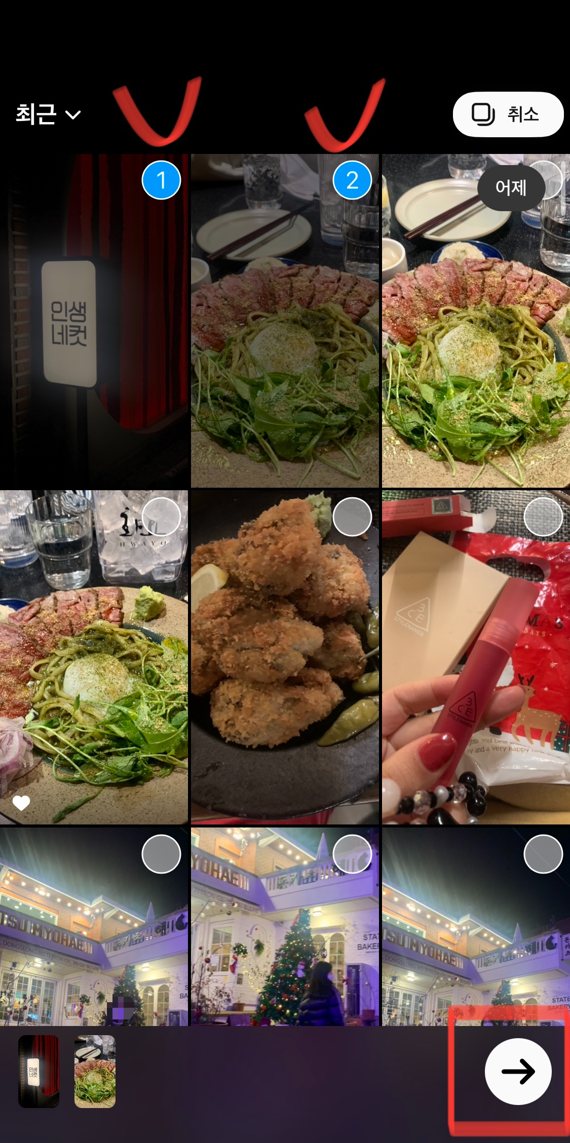 갤러리에서 넣고싶은 사진을 선택 후 하단의 화살표 버튼을 터치합니다.