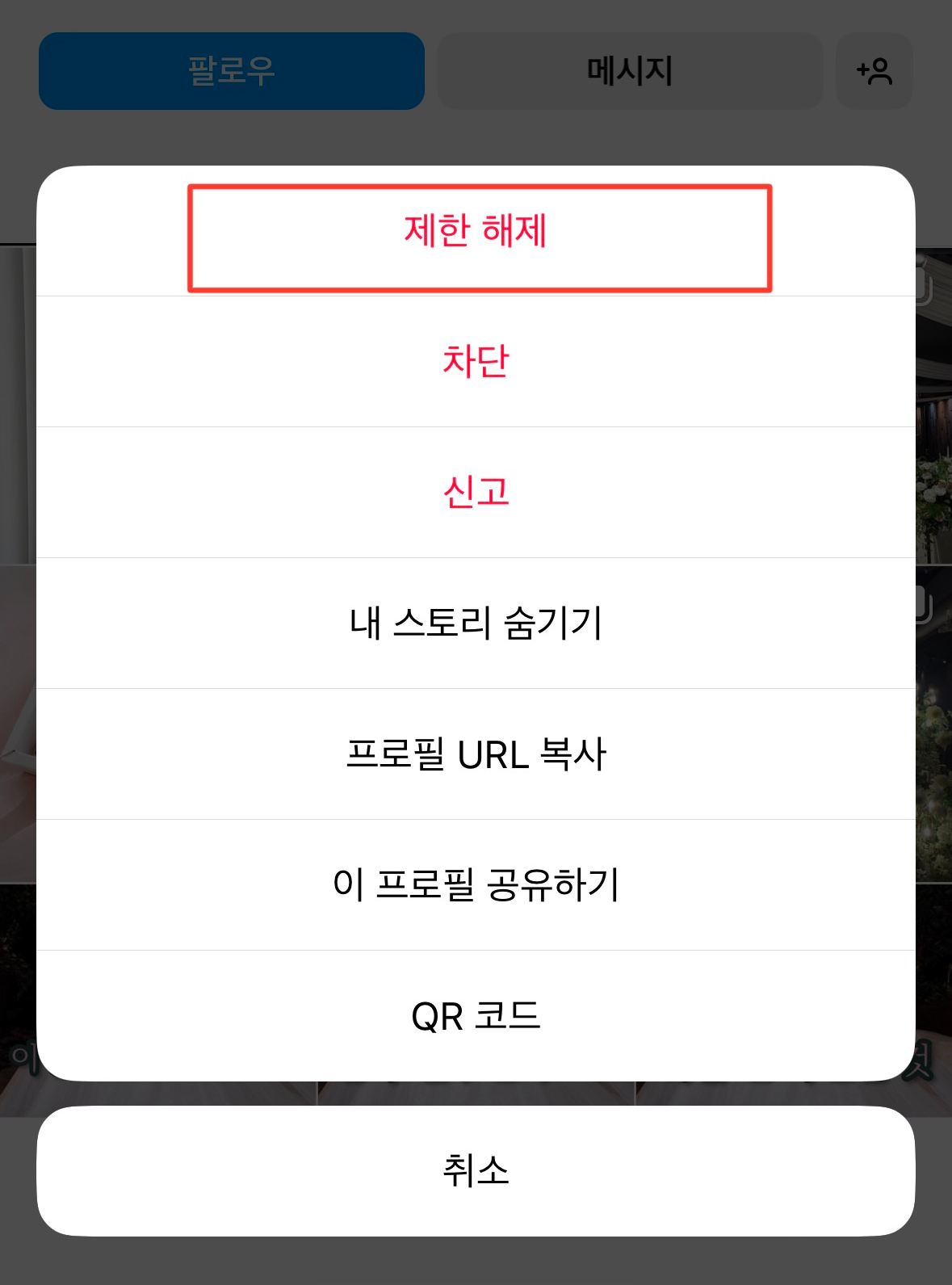 제한을 푸는 방법은 간단합니다. 다시 [메뉴]으로 들어가 [제한 해제]을 누르면 상대방의 제한이 풀리게 됩니다