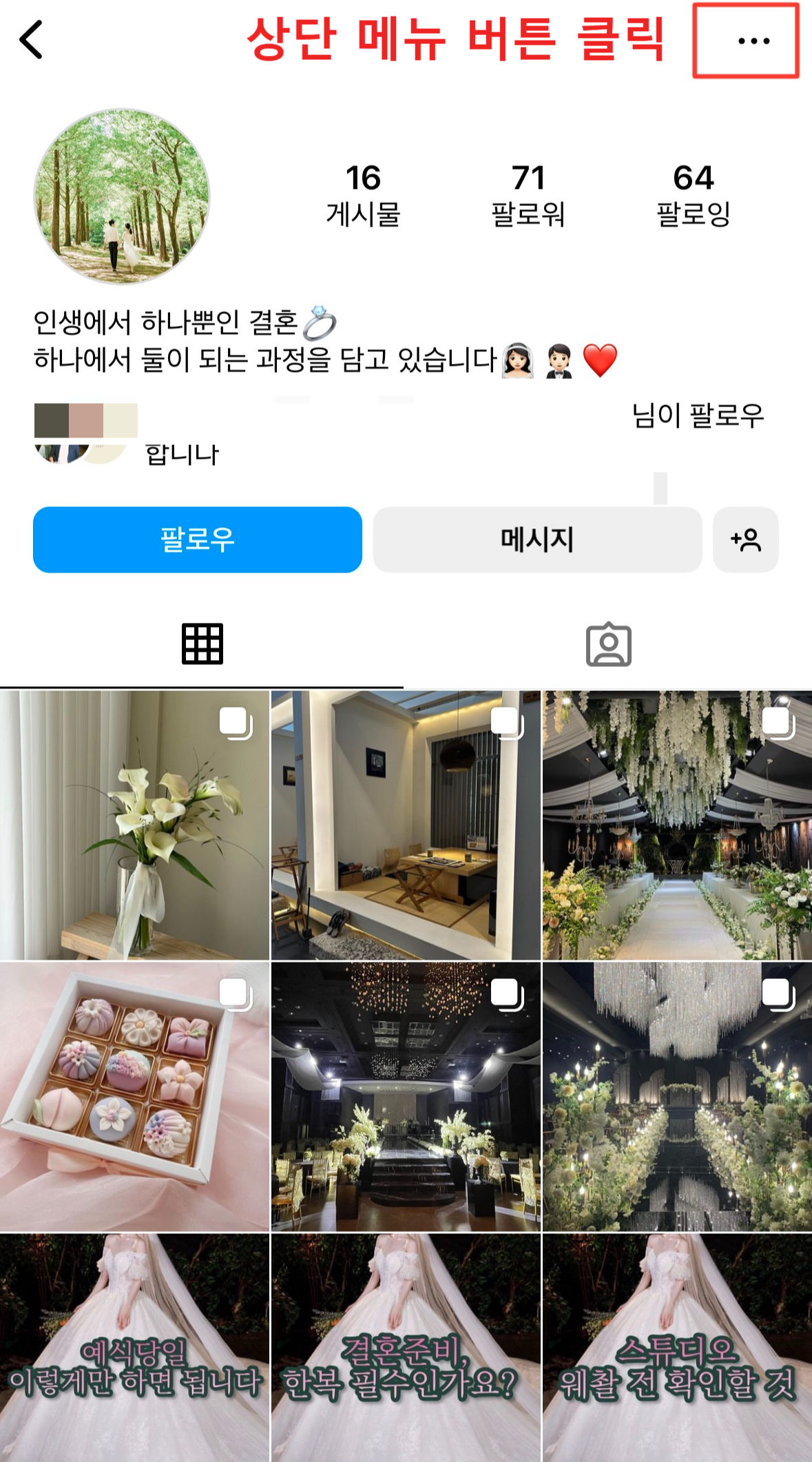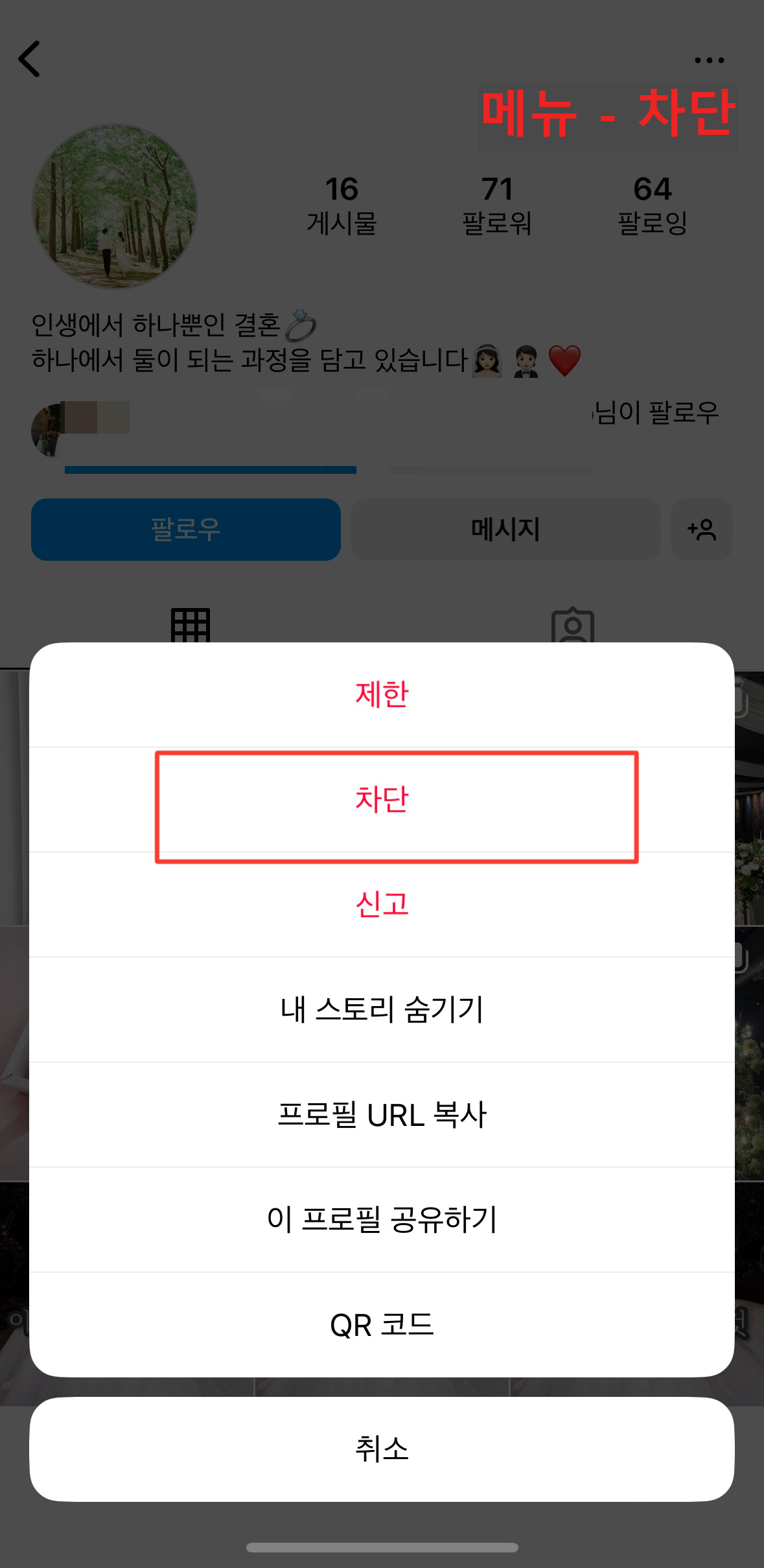 차단할 계정 상단 점 3개 버튼 [메뉴]를 선택한 후 [차단]을 클릭하면 됩니다.