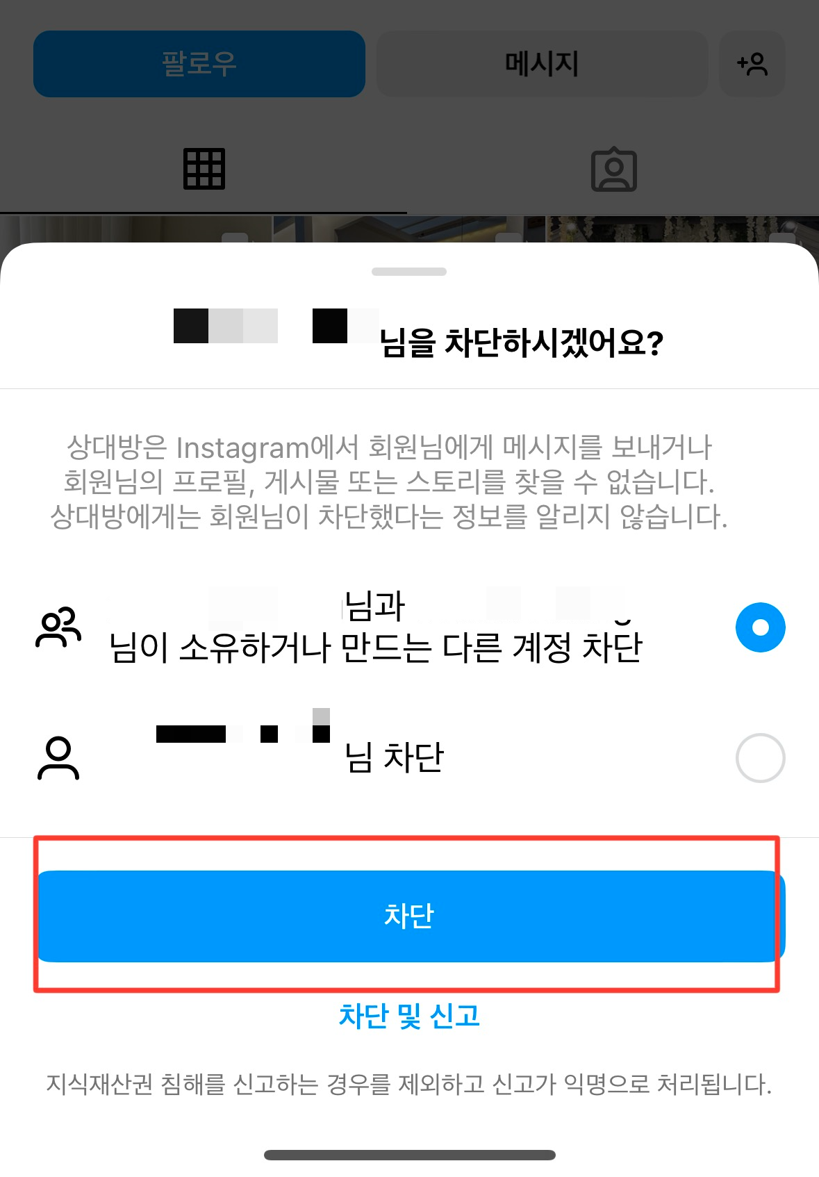 차단할 계정과 그 계정이 만드는 다른 계정까지 차단할 수 있습니다. 차단 버튼을 누르면 하단에 차단이 되었다고 알림 팝업이 뜹니다.
