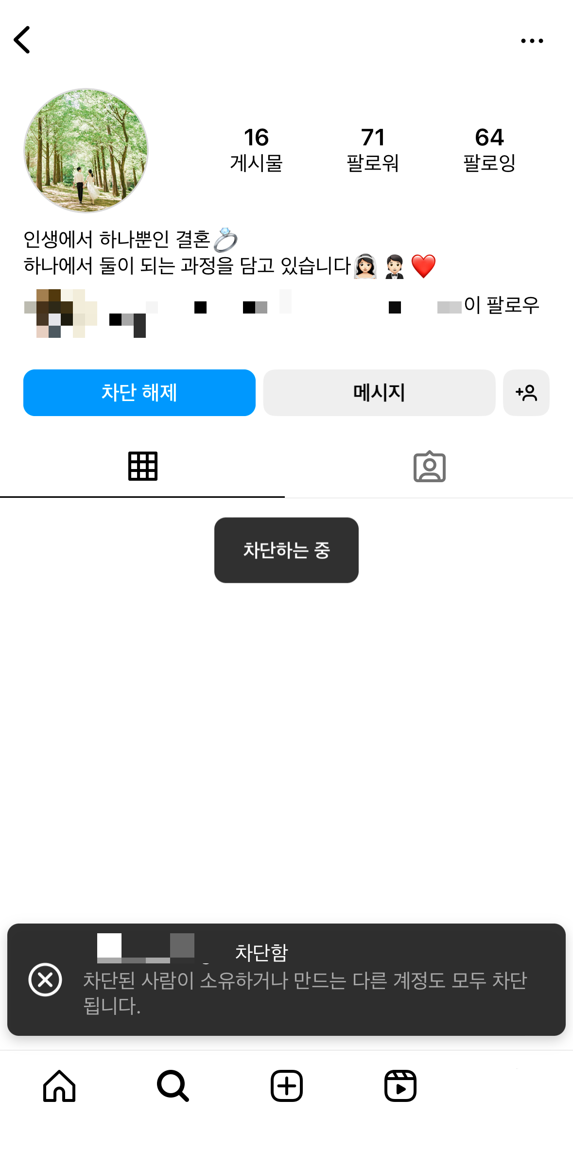 차단을 당한 계정으로 차단 시킨 계정을 검색해 보았습니다. 인스타그램 차단을 당하면