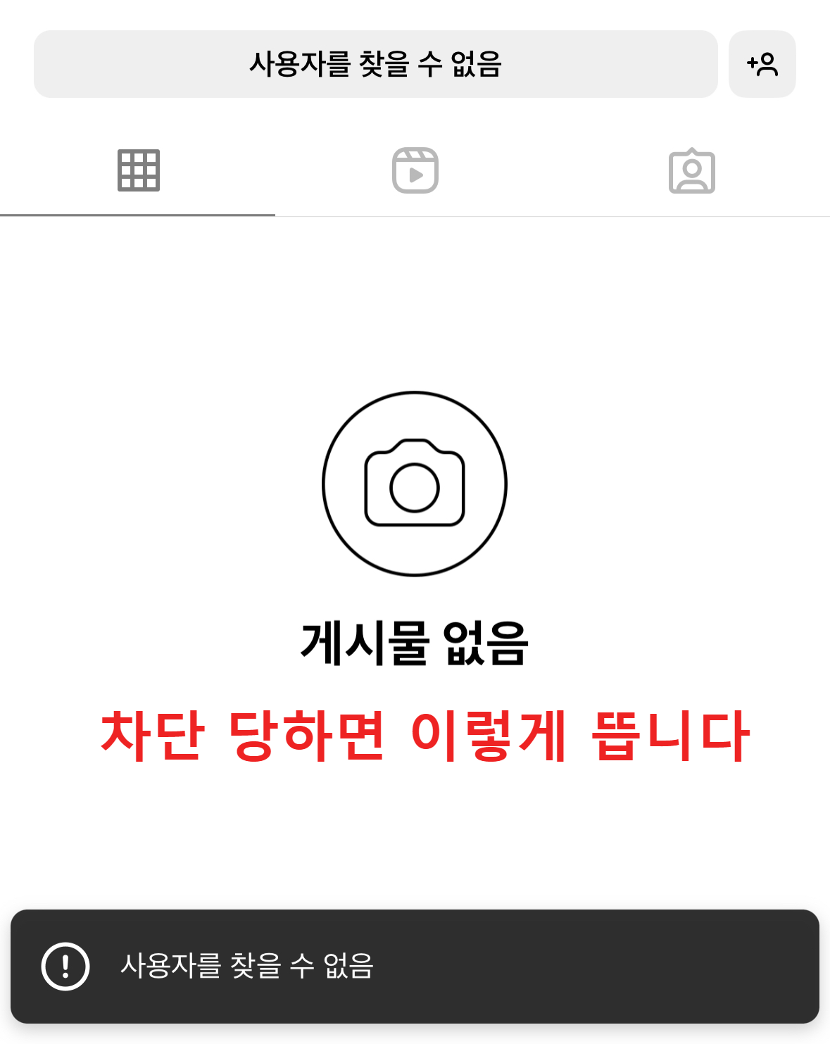 검색이 안되서 예전 댓글이나 디엠 흔적을 타고 들어간다면 위와 같이 뜹니다. 프로필에 [게시물 없음]이라고 뜨고 [사용자를 찾을 수 없다]는 팝업이 뜹니다.