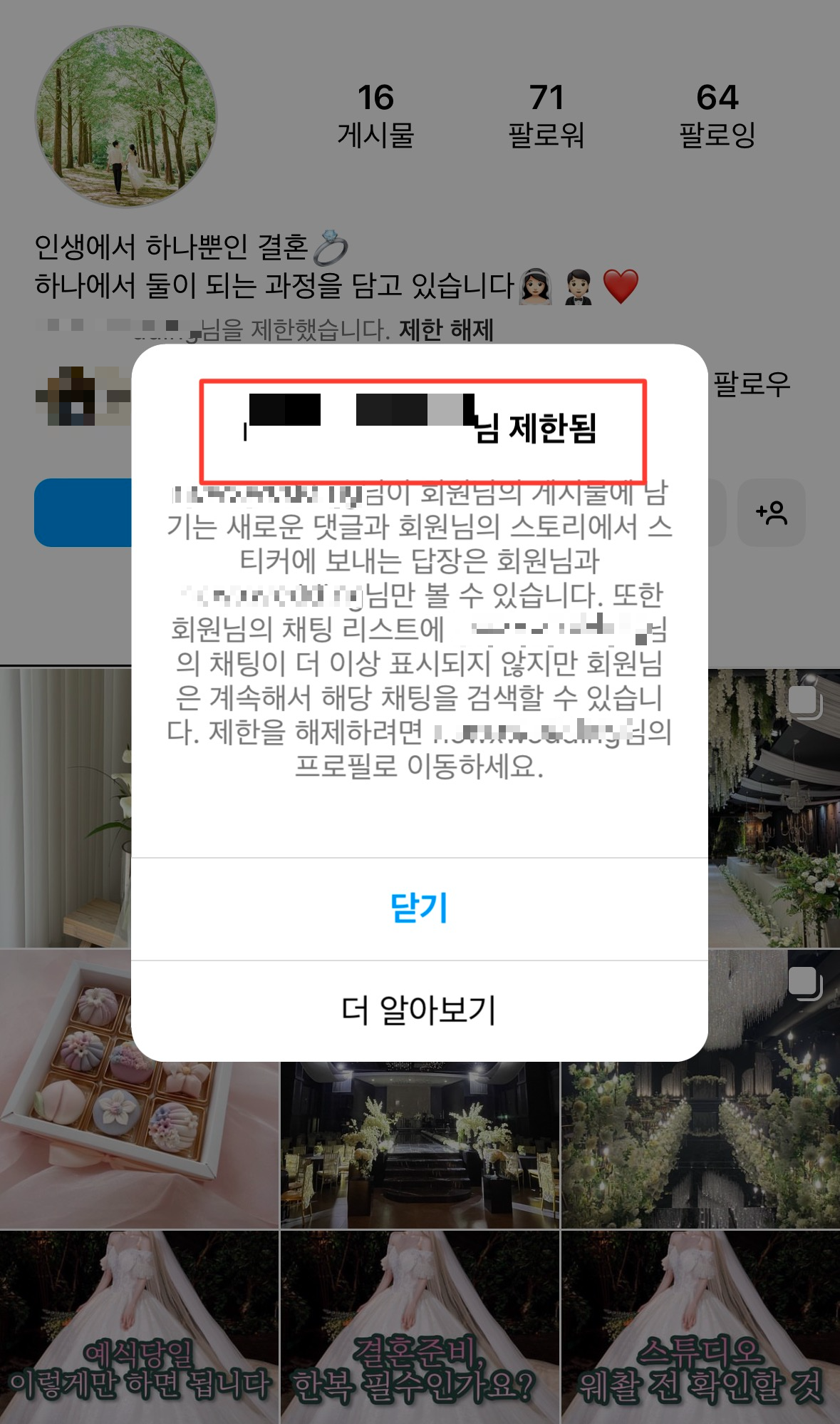 두 가지의 가장 큰 차이점은 인스타 제한은 상대방이 본인이 제한당했는지 모르는 것이고, 차단은 알 수 있다는 것입니다.