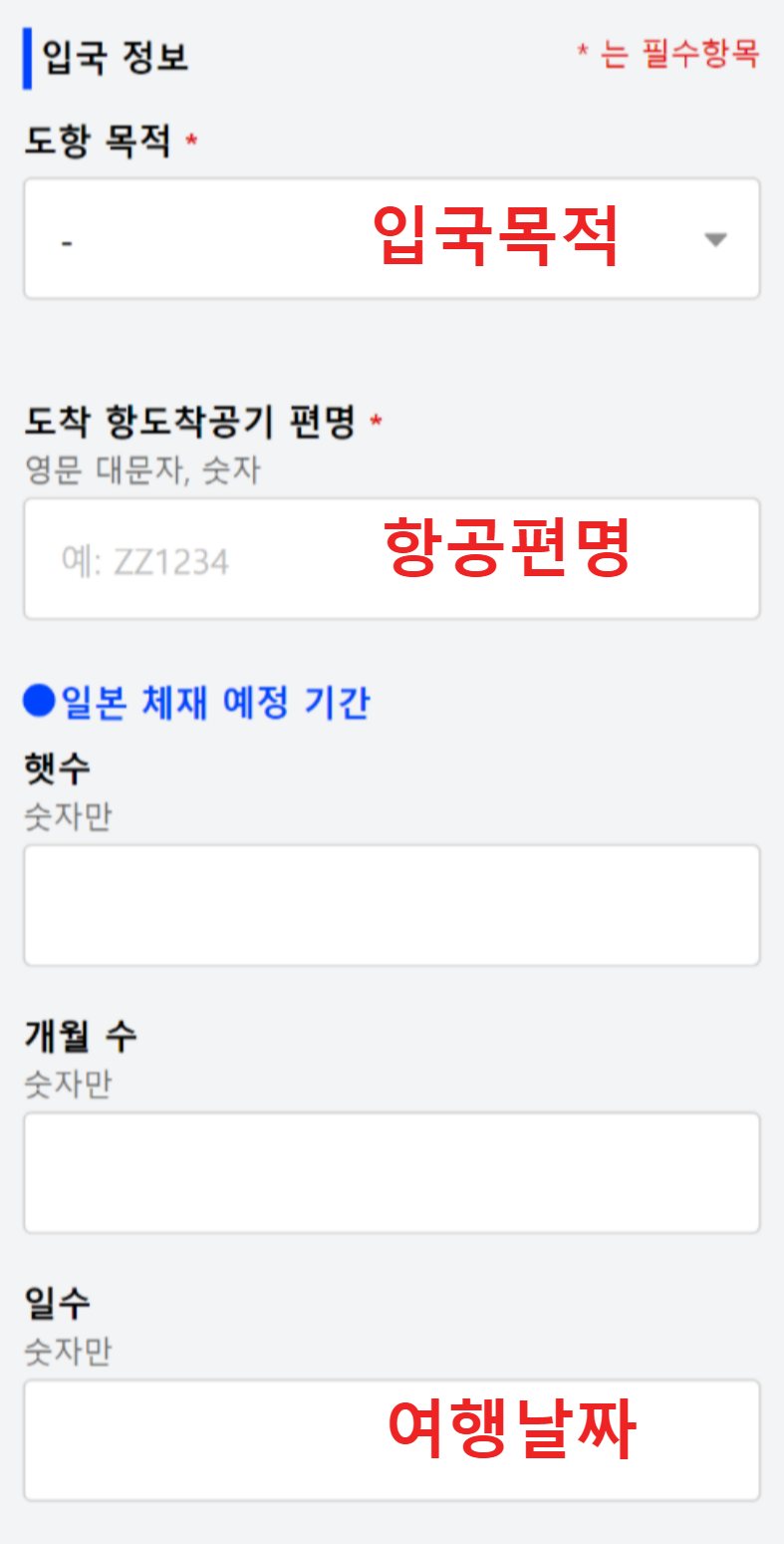 기본정보인 이름, 생년월일, 현주소를 입력하고 입국정보를 입력합니다. 도항목적은 관광을 선택했고 일수는 몇 밤 묵는지 일수를 넣었습니다.
