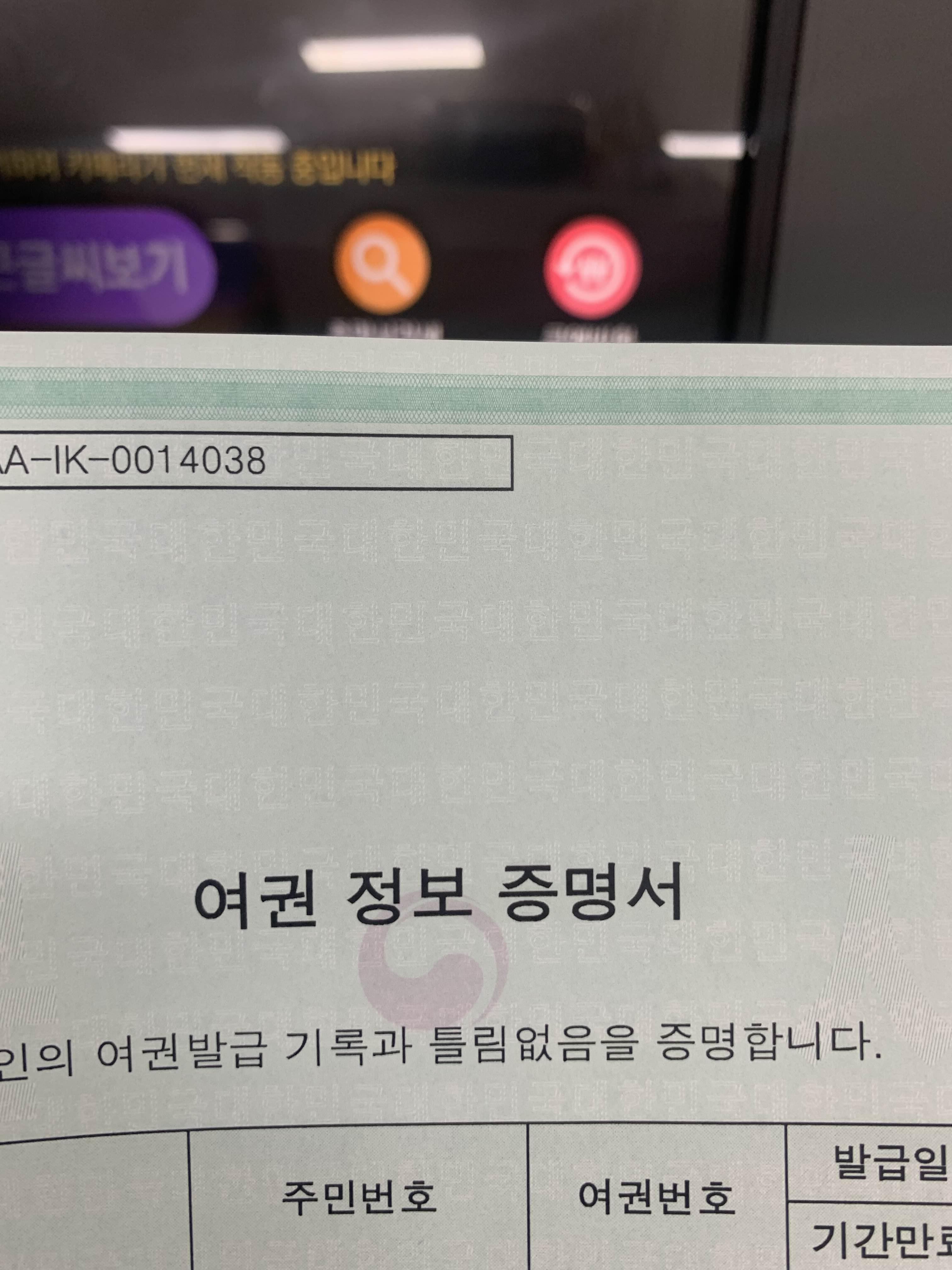 여권정보 증명서를 발급하면 여권정보와 주민번호, 여권발급일과 기간만료일 등이 기재되어 나옵니다. 위 증명서와 여권을 함께 제공하면 신분증으로 사용하실 수 있습니다.
