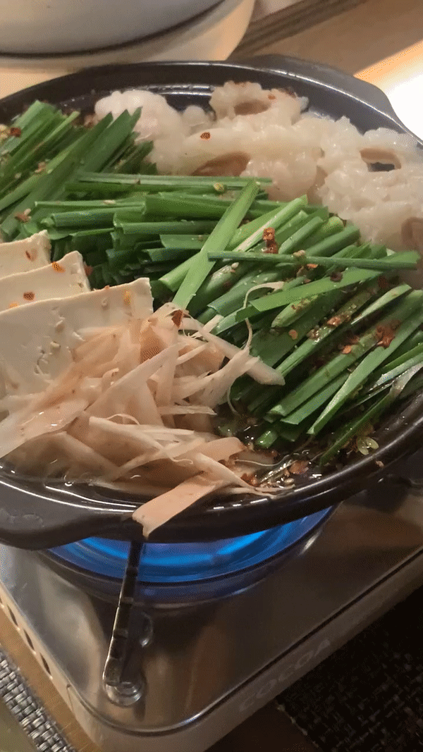 모츠나베란? 곱창전골을 뜻하는 것으로 모츠(소, 돼지의 내장) + 나베(전골)를 뜻합니다. 곱창, 숙주나물, 양배추, 부추, 버섯 등을 넣어 자작할 때까지 끓여서 먹는 일본식 곱창전골이에요. 이게 끓이면 끓일수록 단맛이 나옵니다. 그리고 아삭한 야채의 식감이 좋아요.