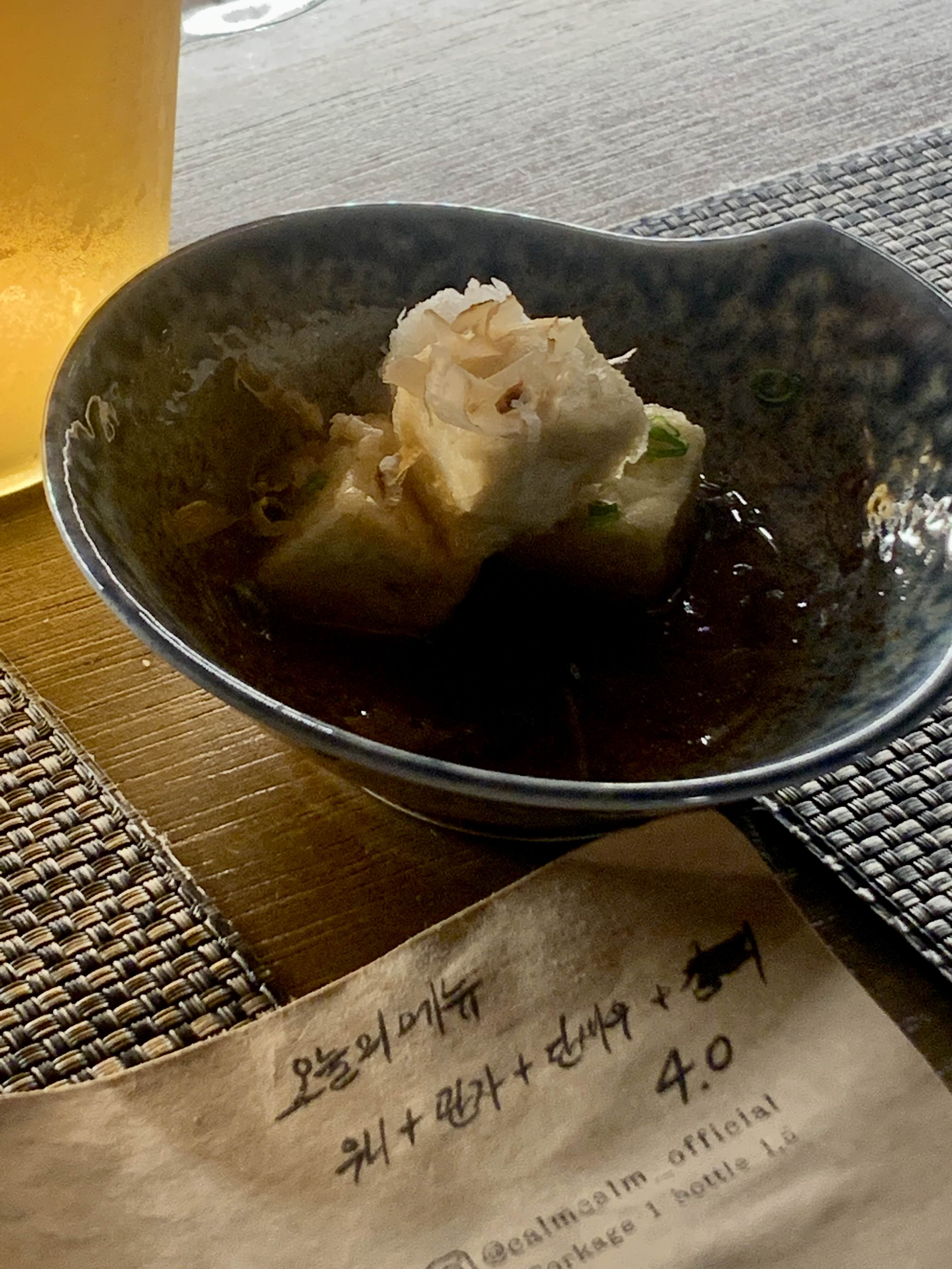 공간은 협소한 편입니다. 창가자리 4 좌석, 바 자리 4 좌석 그리고 중앙 테이블 2개가 있습니다. 들어가면 기본 반찬으로 두부 튀김을 주십니다. 이거 소스가 새콤해서 은근히 맛있어요.