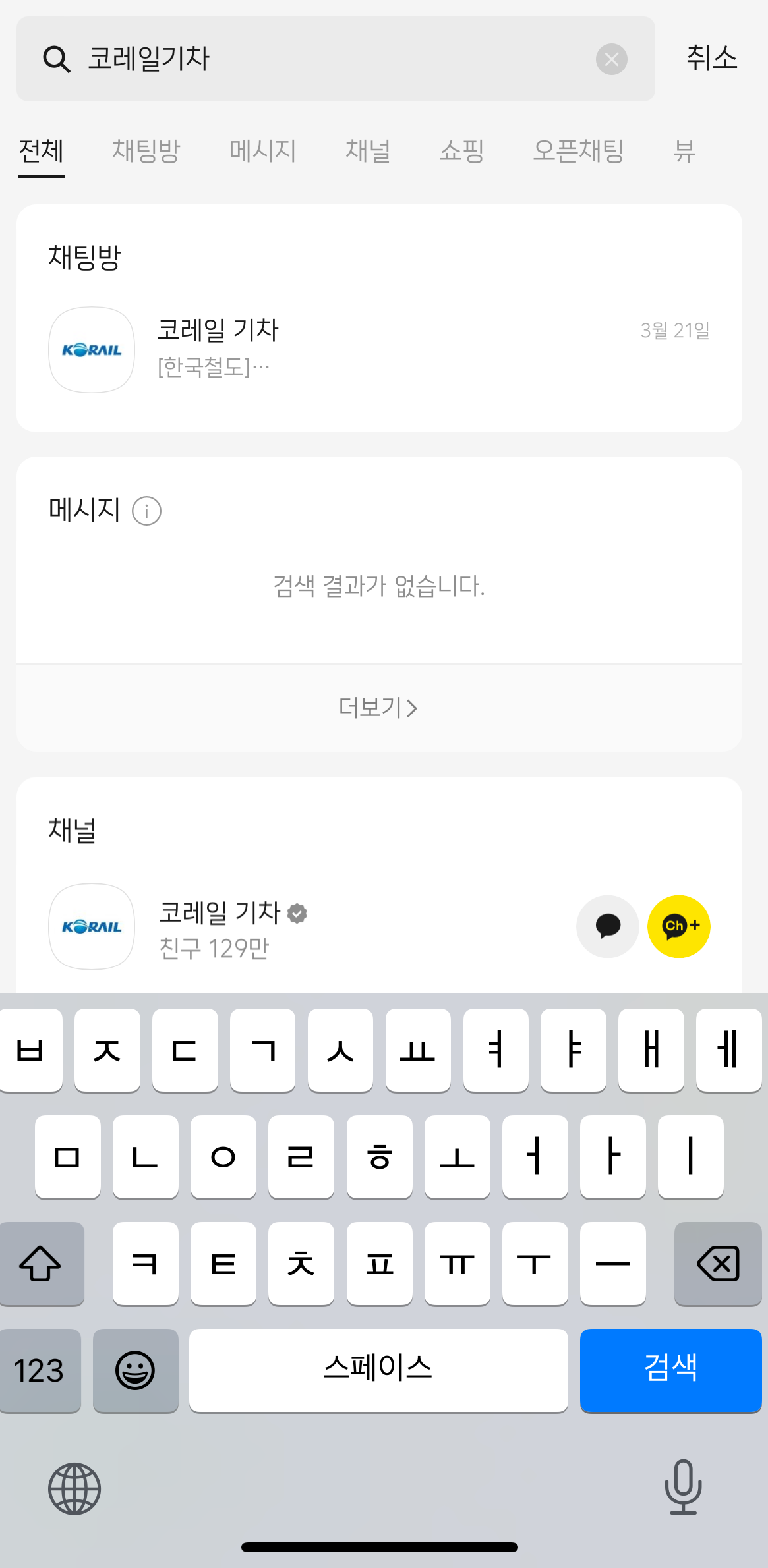 카카오톡 홈화면에 들어가 상단 돋보기 버튼을 눌러 [코레일 기차]라고 검색합니다. 코레일 기차 채널이 뜨면 해당 채널로 들어갑니다.