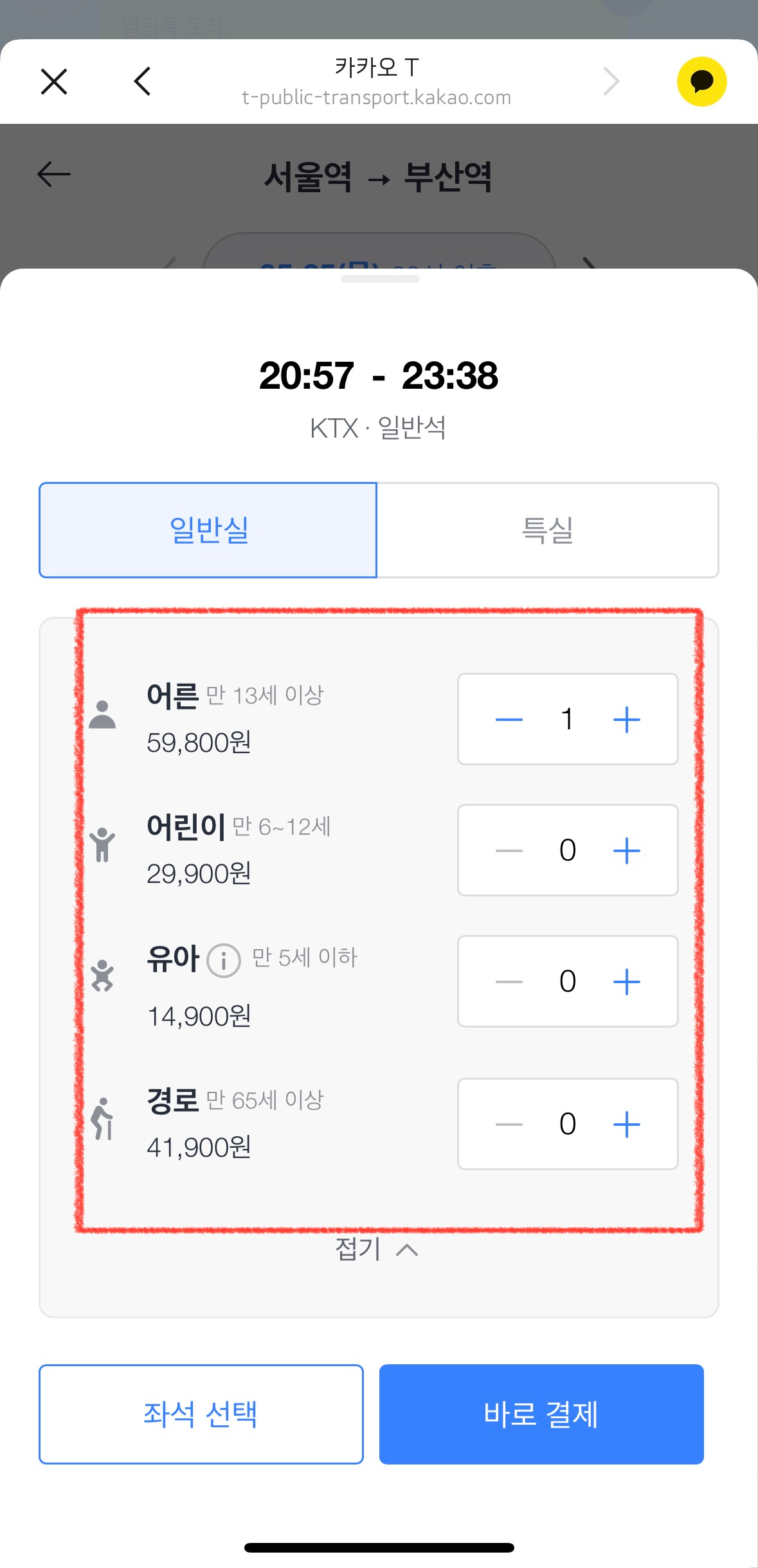 예약하고자 하는 날짜, 기차 시간을 선택한 후 객실 유형 (일반실/특실)을 선택합니다. 그리고 아래에 [승객타입 더 보기]를클릭해주세요.