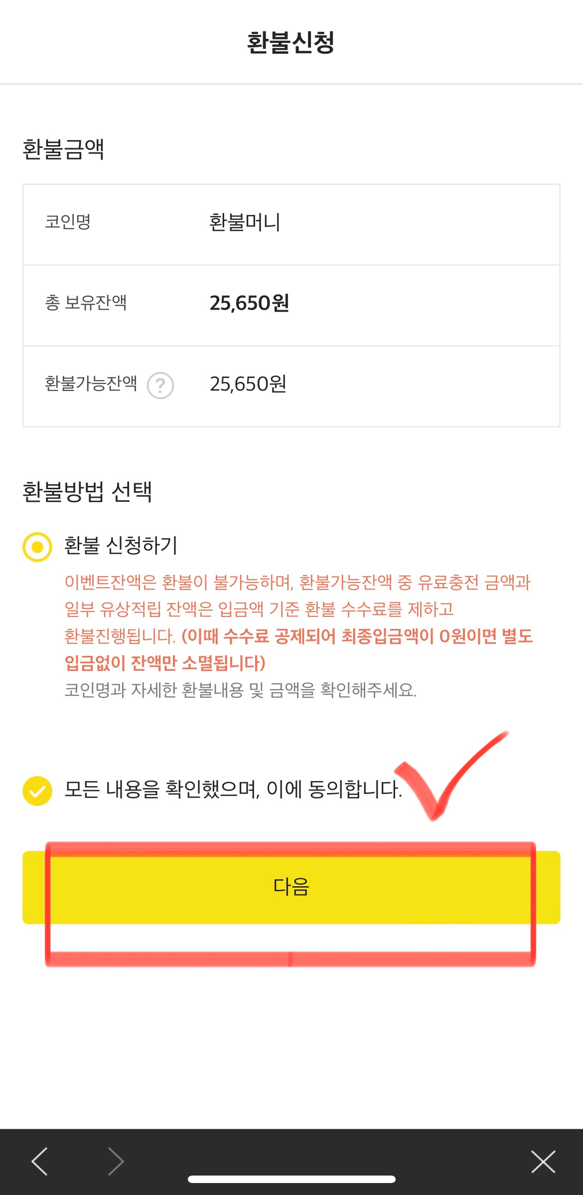 환불머니 보유금액을 확인한 후 환불신청하기를 선택합니다. 그리고 동의 버튼을 클릭하고 다음을 눌러줍니다. 그리고 환불 현금금액을 확인한 후 아래의 [환불 신청]을 클릭합니다.
