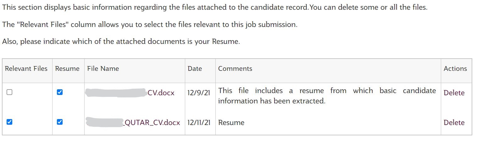 업로드된 두 개의 CV를 확인할 수 있는데 이때 기존 CV를 삭제하고 싶으시면 옆의 Delete 버튼을 누르면 기존의 CV를 삭제하겠냐는 팝업창이 뜨게 됩니다.