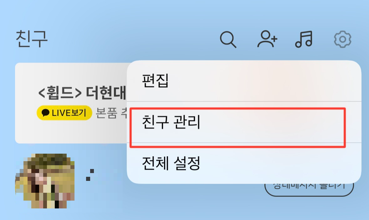 친구 관리창이 나오면 중간에 있는 [친구 추천 허용] 탭을 터치하여 비활성화해줍니다.