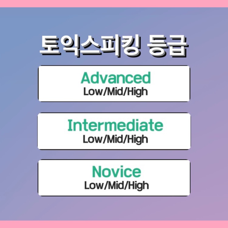 레벨체계가 오픽과 유사하게 변경되었습니다. 오픽과 동일하게 이어지지만 오픽과 다르게 토익스피킹은 Advanced 레벨이 3가지로 나뉘어지게 됩니다. (AL, AM, AH)