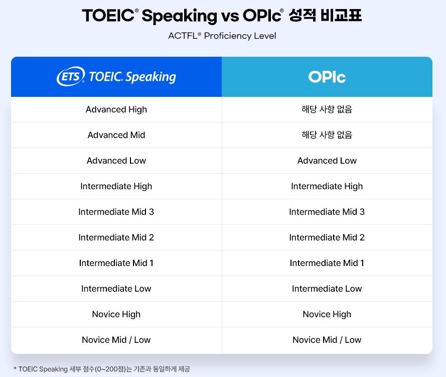 OPIc과 TOEIC Speaking 점수비교표입니다.