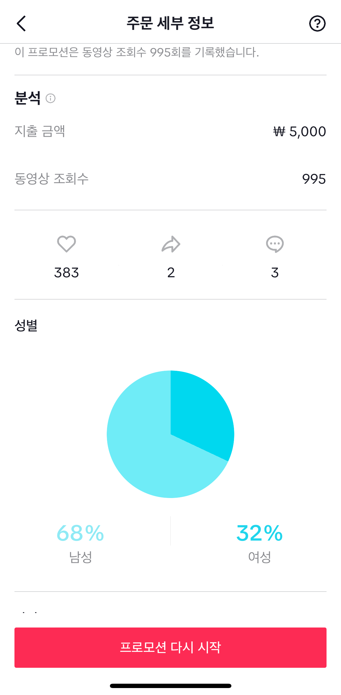 그리고 주문세부 정보와 함께 동영상 조회수, 좋아요 하트수, 공유수, 댓글수 그리고 시청자의 성별과 나이, 어느 나라에서 가장 많이 조회됐는지 나라까지 알 수 있습니다.