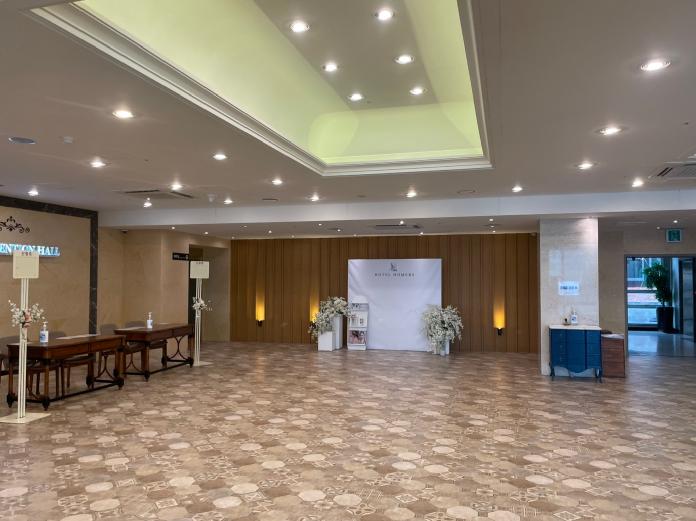 호메르스 호텔 웨딩홀의 가장 좋은 점은 단독홀에 2시간 예식이 가능하다는 점입니다. 11시와 같이 이른 시간이 아닌 황금 시간대인 12시를 첫 시간으로 잡을 수 있고 그다음 예식은 2시 예식으로 진행이 가능합니다.