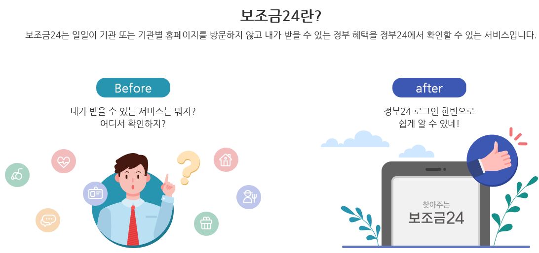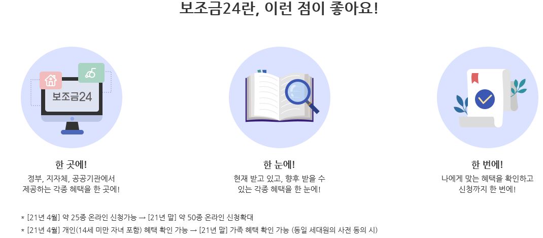 보조금24라는 홈페이지를 통해 정부에서 지원해주는 여러가지 혜택들을 한눈에 알 수 있으며 홈페이지에서 바로 신청까지 가능하기 때문에 매우 간편해졌습니다. 많은 분들이 정부에서 받을 수 있는 혜택들을 알아가시는 기회가 되었으면 좋겠고 폭 넓게 지원받으시길 바랍니다.