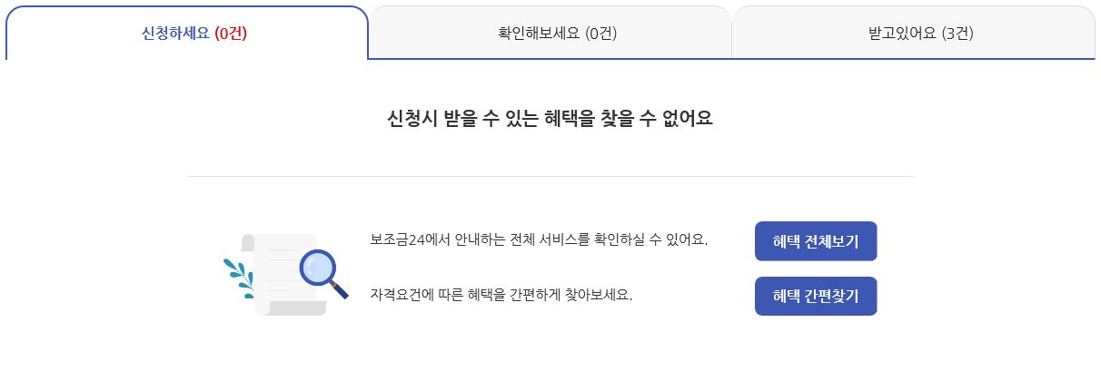 저는 지금 당장 신청해야할 보조금은 없다고 나옵니다. 그리고 오른쪽 탭에 현재 받고 있는 보조금은 3건으로 나오는데 실제 받고 있는 거 뿐만 아니라 이전에 신청해서 떨어진 것들까지 다 받고있는 것으로 나옵니다. 아래에 혜택 전체보기/ 혜택 간편찾기 중 나에게 맞는 혜택을 찾기위해 ‘혜택 간편찾기’를 눌러줍니다.