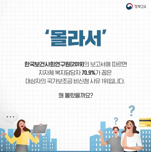 한국보건사회연구원의 보고서에 따르면 지자체 복지담당자 70.9%가 꼽은 대상자의 국가보조금 비신청 사유 1위가 ‘몰라서’라고 합니다. 실제로 중앙부처, 지자체, 공공기관 등에서 관리하는 보조금과 서비스 혜택은 수만개나 있지만 이 많은 혜택 중에서 무엇이 나에게 해당되는지 국민들이 알기가 어려웠습니다.