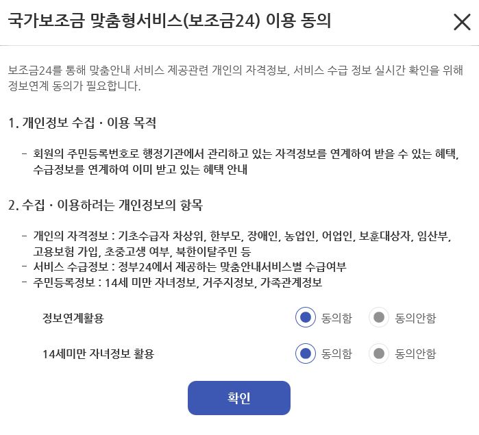 보조금 맞춤형 서비스(보조금24)를 이용하기 위해 개인정보 연계활용에 동의를 누르고 확인을 눌러줍니다.
