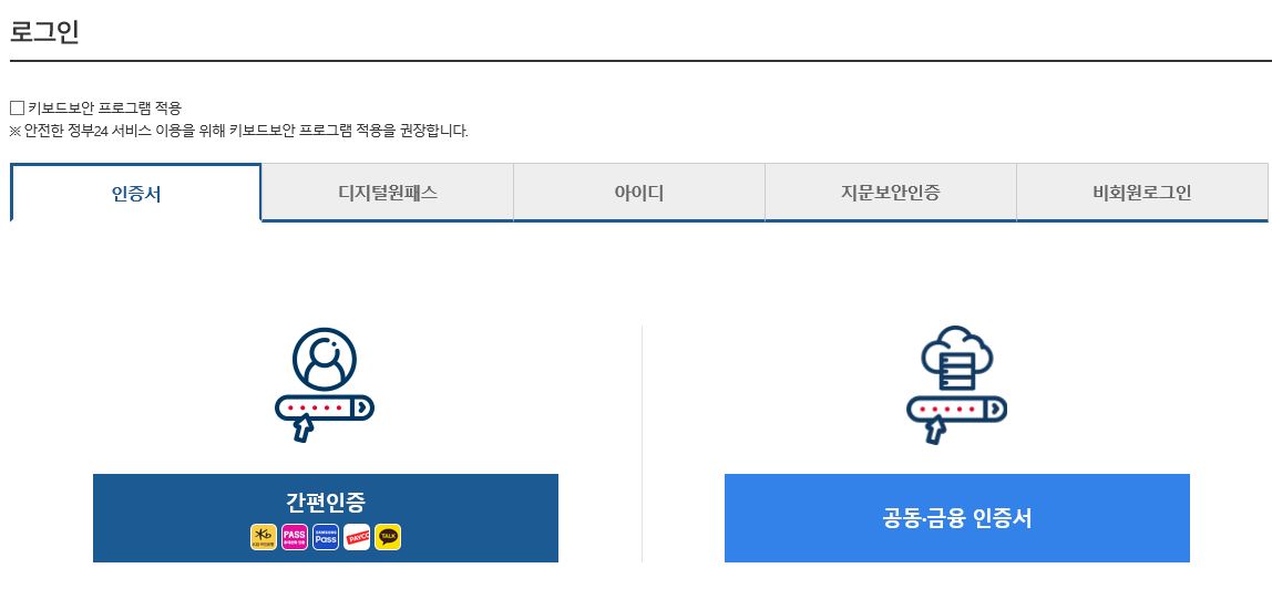 본인 확인을 위한 로그인을 해야 합니다. 공동, 공인 인증서로도 가능하며 카카오톡 지갑 서비스로 간편하게 로그인 할 수 있습니다.