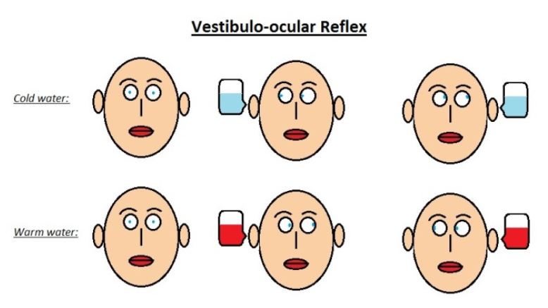 온도에 따라 어떤 반응을 일으키는지 검사합니다. 세반 고리관 내 림프에 찬바람이 들어오면 시계방향으로 돌아가고 따뜻한 바람이 들어오면 반시계 방향으로 돌기 때문에 전정 안구 반사에 교란을 일으킵니다. 이때 세상이 빙글빙글 도는 듯한 어지럼증을 느껴야 정상입니다.