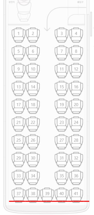 맨 뒷자리는 의자도 뒤로 젖혀지지 않아 불편하고 39번 자리는 급정거했을 때 앞으로 쏠릴 수 있어서 위험합니다.