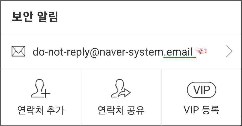 진짜 네이버 측에서 온 메일은 [네이버]라는 이름과 공식 마크가 붙어 있지만,  피싱 메일은 [보안알림]이라는 이름으로 메일이 왔으며 공식 마크도 붙어 있지 않습니다.
