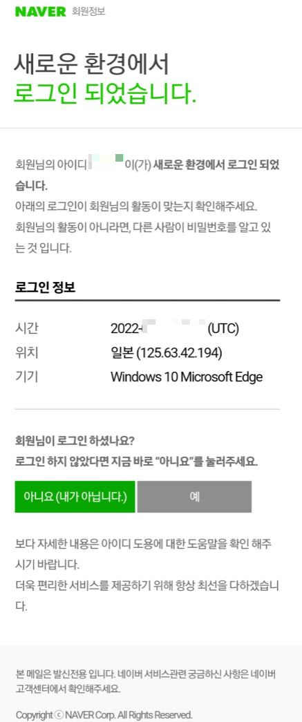 네이버 보안설정에 새로운 환경에서 로그인을 하면 알림을 제공해주는 것으로 설정이 되어있던 터라 이런 메일을 받아본 적이 있습니다. 이 메일은 사용하던 PC 외에 새로운 곳에서 로그인을 시도하면 메일이 오게 됩니다.