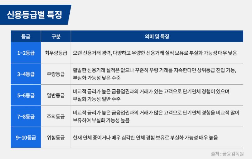 개인의 다양한 신용정보를 종합적으로 검토하여 점수를 내고 등급화한 것입니다. 점수와 등급이 좋을 수록 이후 연체 등으로 인한 신용위험이 발생할 가능성이 낮다고 판단하기 때문에 금융회사에서는 개인에게 대출이나 신용카드를 만들어 줄때 NICE 혹은 KCB 등의 외부 신용평가기관의 신용등급을 참고합니다.