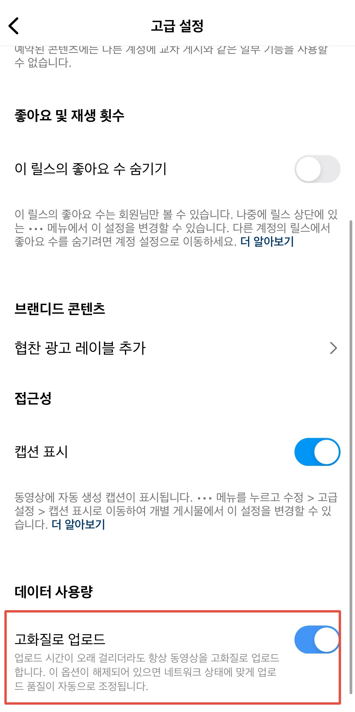 릴스 올릴 영상을 선택한 후 마지막 단계에서 설정할 수 있습니다. 아래로 스크롤 내려 설정 – 계정 – 데이터사용 – 고화질업로드를 활성화해 주면 고화질로 업로드가 됩니다. 고화질로 올리는 대신에 업로드하는 시간이 조금 오래 걸린다는 단점이 있습니다.