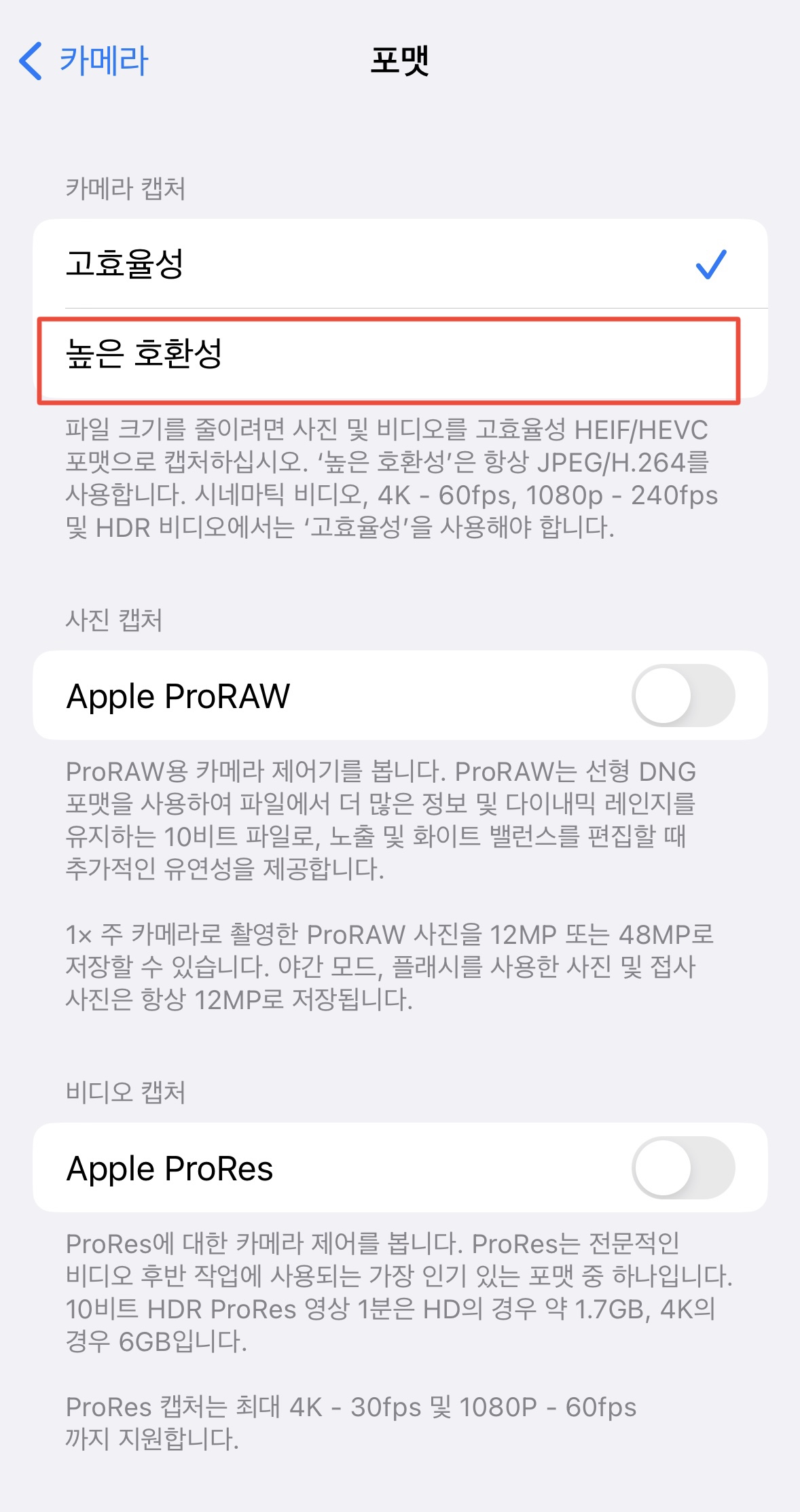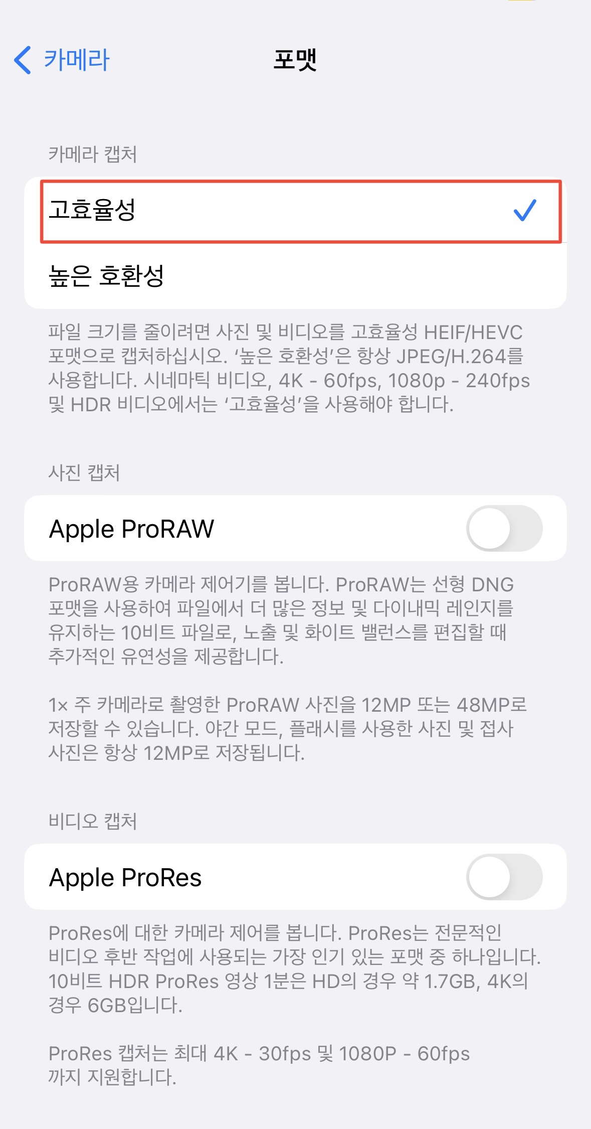 2. 설정 – 카메라 – 포맷 – 고효율성