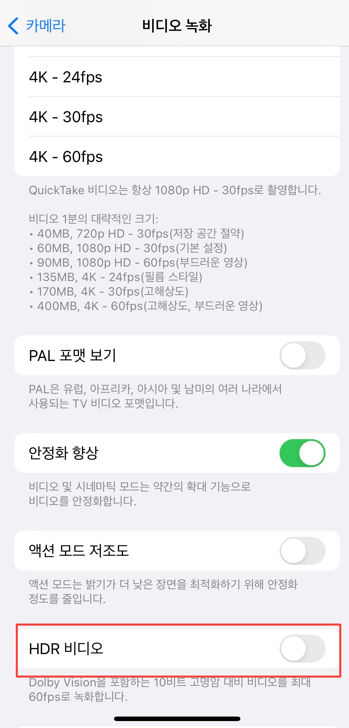아이폰설정 – 카메라 – 비디오녹화 아래로 스크롤 내려보면 HDR 비디오 탭이 있습니다. 이 탭을 비활성화 시켜줍니다.